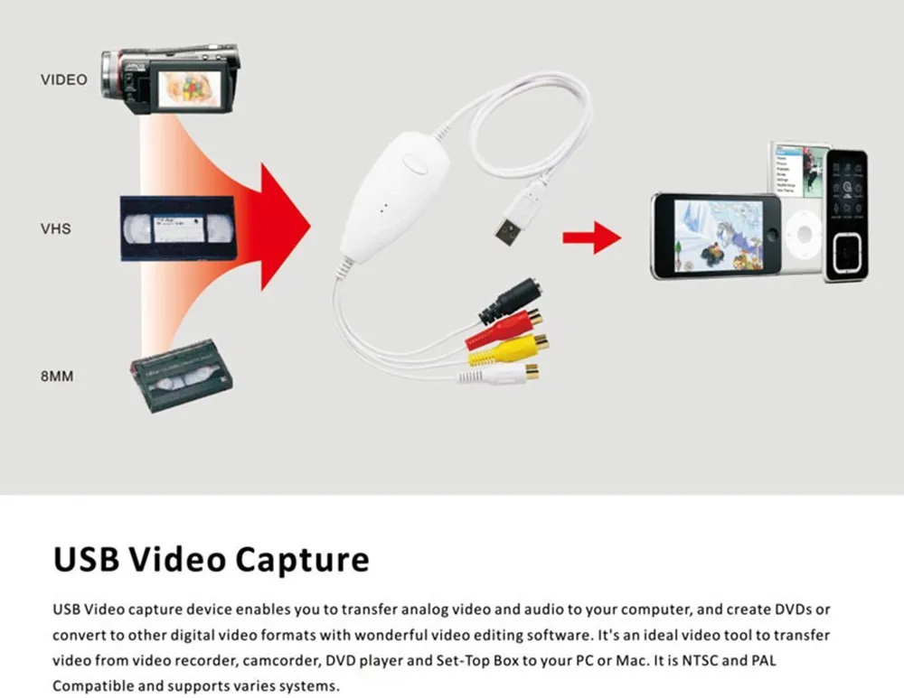 USB2.0 аудио видео Захват, конвертировать Аналоговое видео из VHS, Hi8, все видеокамеры, dvd-плеер, спутниковое телевидение и т. Д. ezcap172