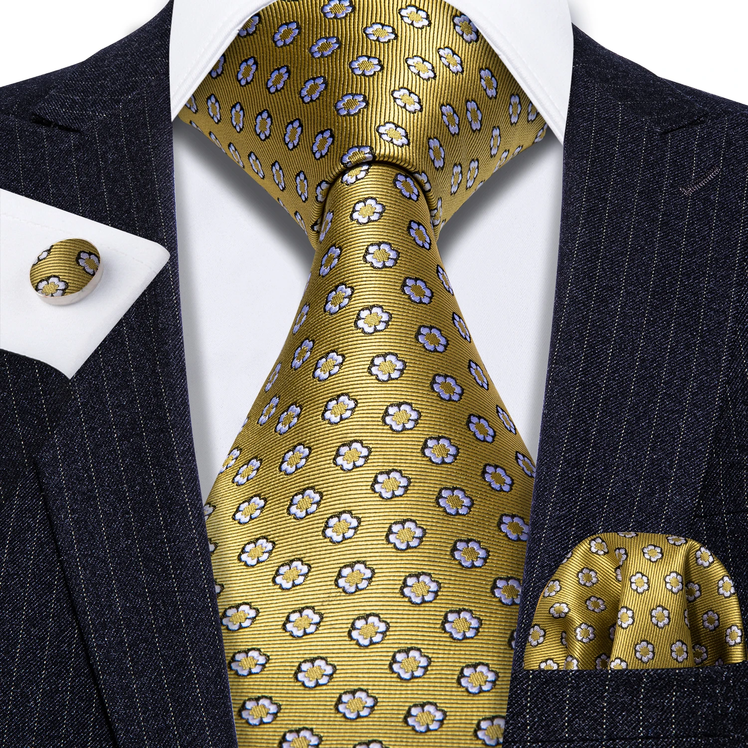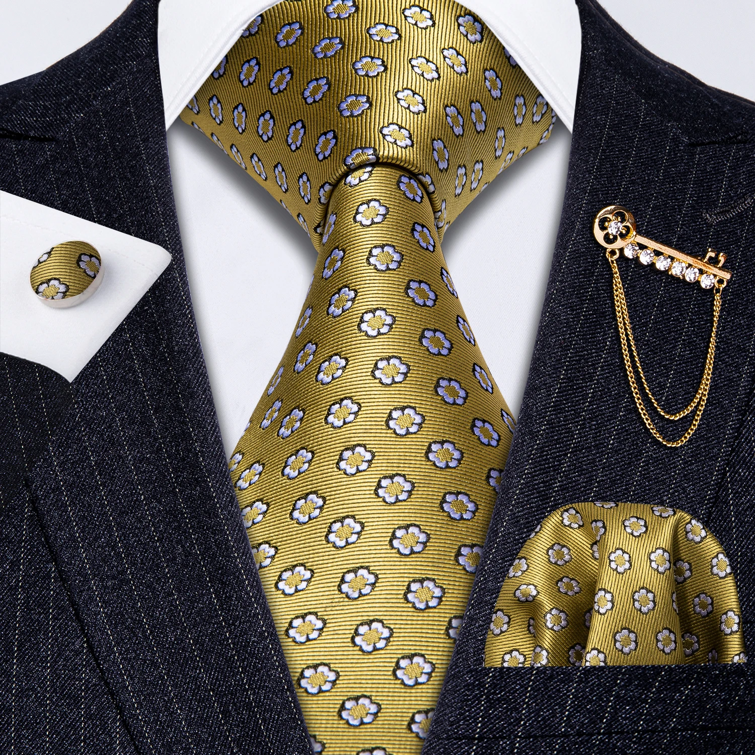 Цветочный мужской галстук Брошь набор 100% шелковый галстук для мужчин платок запонки Барри. Ван дизайнерский галстук GS-5243 золото Новинка