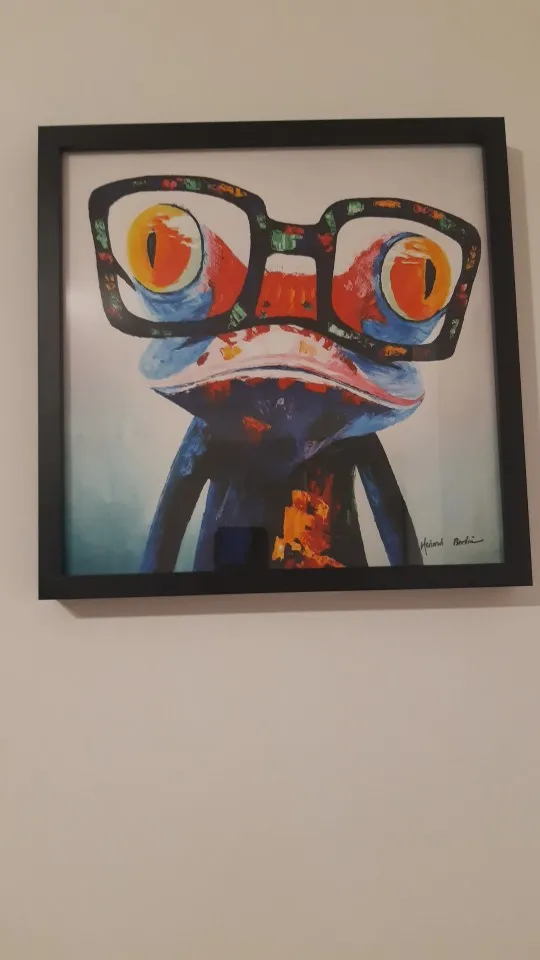 A bought the frog with glasses from the same painting collection to another seller and it was a real painting with 3d effect and awesome glossy colors . This one is only a copy on paper with fade color. Cheap but boring Jai le fokenzary grenouille avec lunettes qui est une vrai toile peinturé que jai payé 30$ avec frame sur un autre site populaire et je croyais avoir le meme produit ici avec cette toile de la meme collection. Mais ce n'est qu'une photocopie de l'original. Couleur fade sur papier. Pas cher mais mon imprimante aurait fait le meme travaille pour 0.02$.