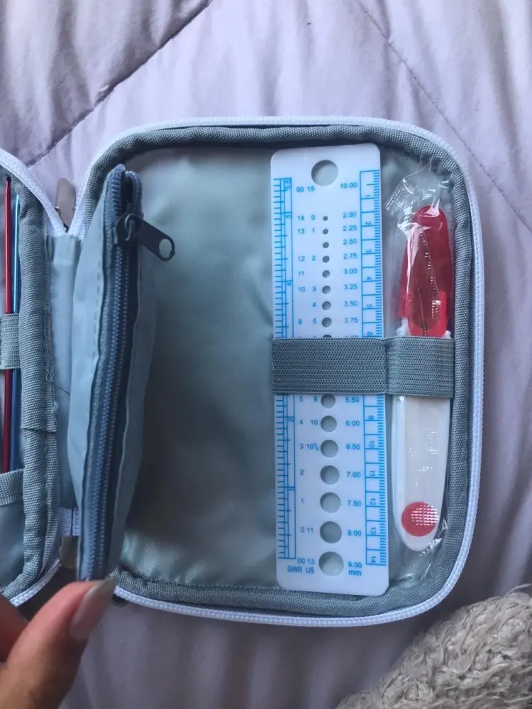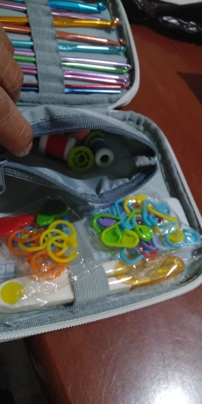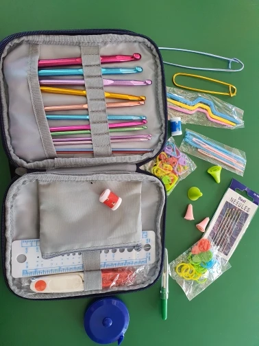 Нормального качества металлические крючки + набор всячины для вязания и шитья. Полностью соответствует фото.