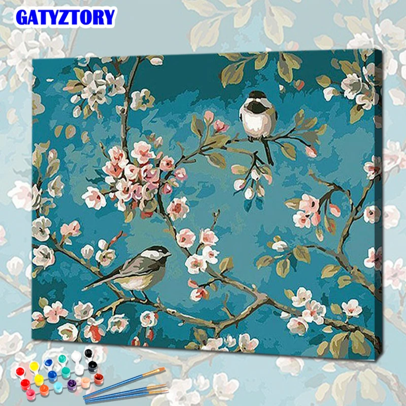 GATYZTORY, птицы с цветком, DIY масляная краска, набор для рисования по номерам, картина для взрослых, детей, искусство, ремесло для домашнего декора стен 50x65 см