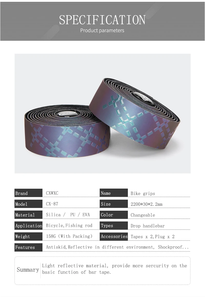 [Прочные материалы]-материал EVA обеспечивает превосходное сцепление с рулем велосипеда и амортизацию 2,2 мм EVA делает его мягче, удобнее и долговечнее.[Запатентованный дизайн]-свет поверхности-сменный материал, яркий и ослепительный. Светоотражающий материал сохранит вашу безопасность в ночное время.[Легко обернуть] поставляется с клейкой подложкой. Его оставаться на сильной. Также Возьмите две полоски отделочной ленты и 2 вилки.