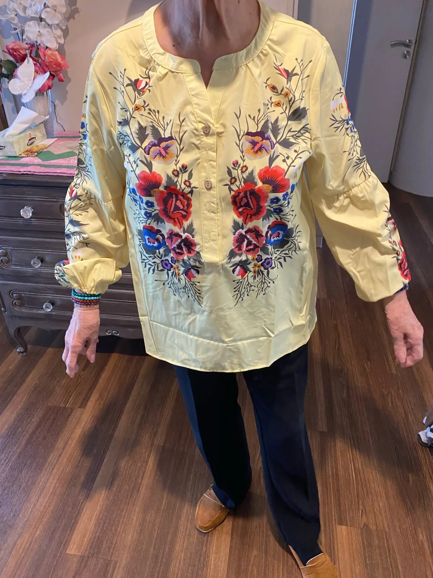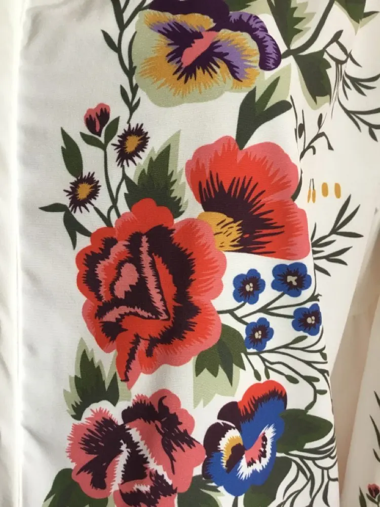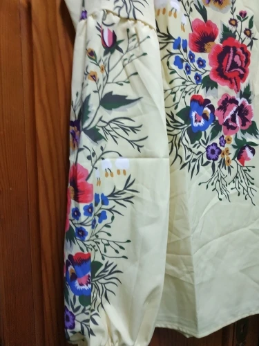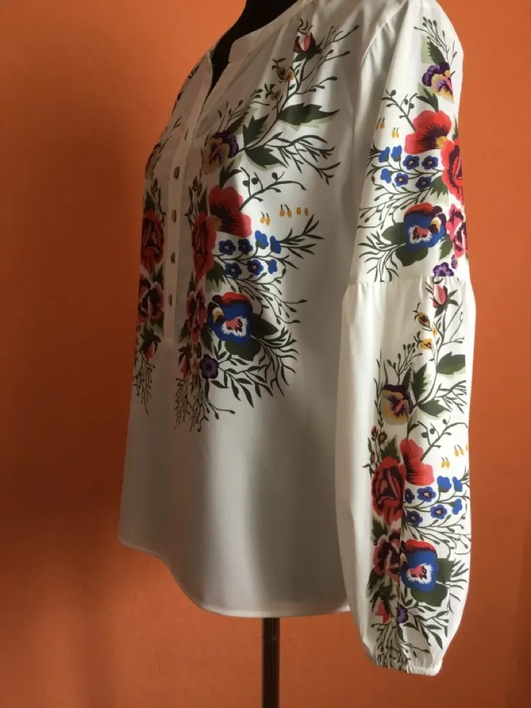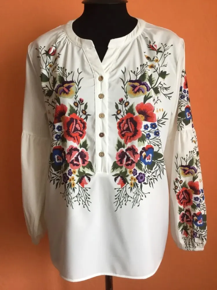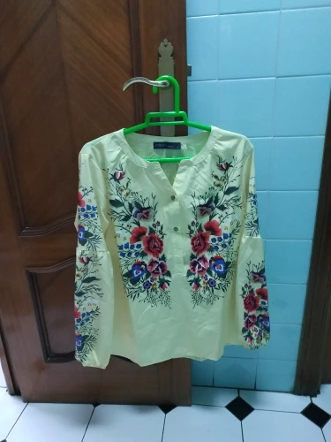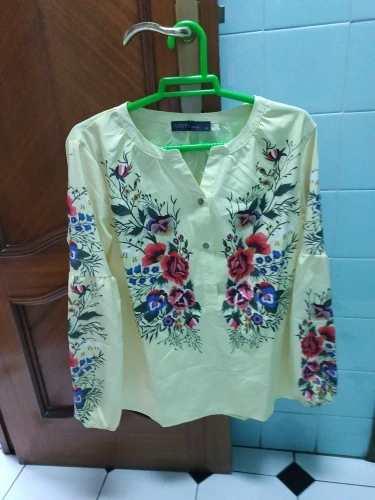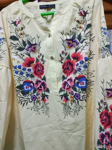 рисунок не вышит, а нанесен , что делает блузка проще. на картинке смотрится более интереснее. ткань плотная, на лето не пойдёт. размер соответствует описанию.