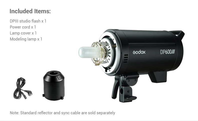 Вспышка Godox DP400III x 1 Крышка лампы (протектор) x 1 Моделирующая лампа x 1 Кабель питания x 1 Руководство пользователя x 1