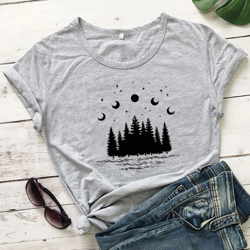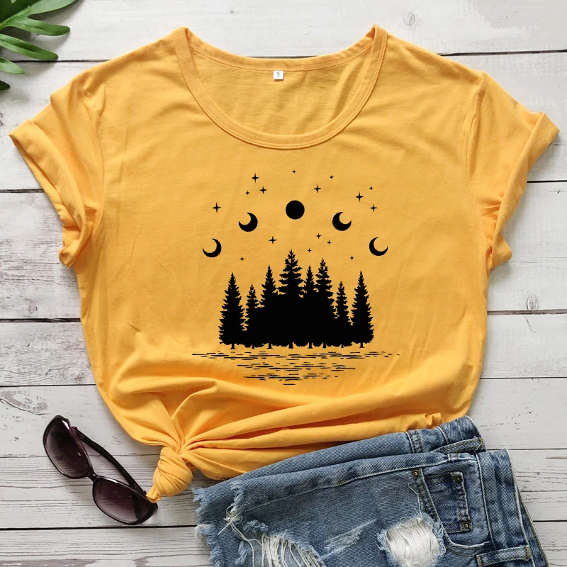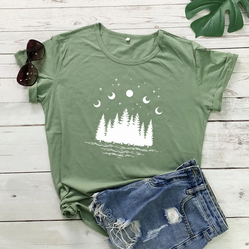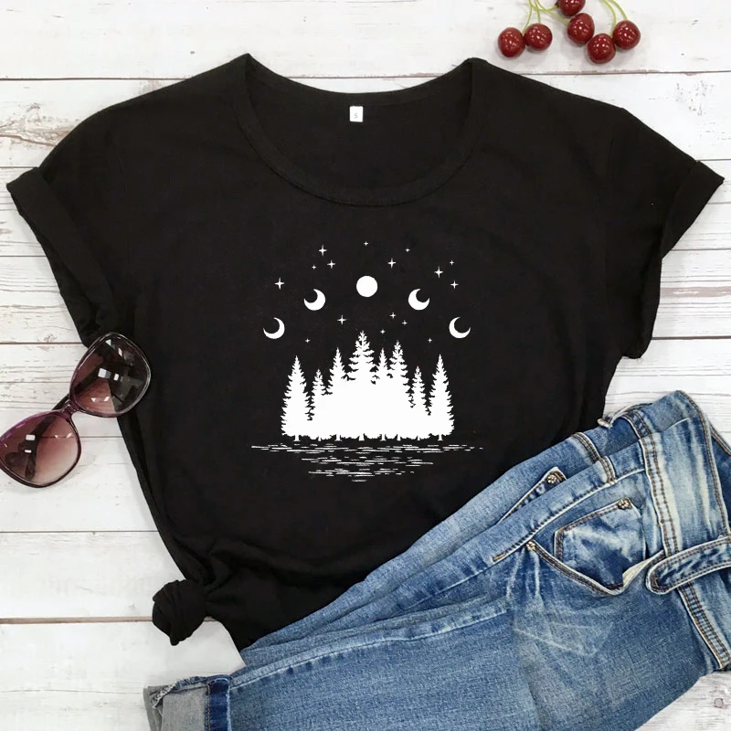 Футболка из 100% хлопка с изображением Луны и леса, женская футболк...