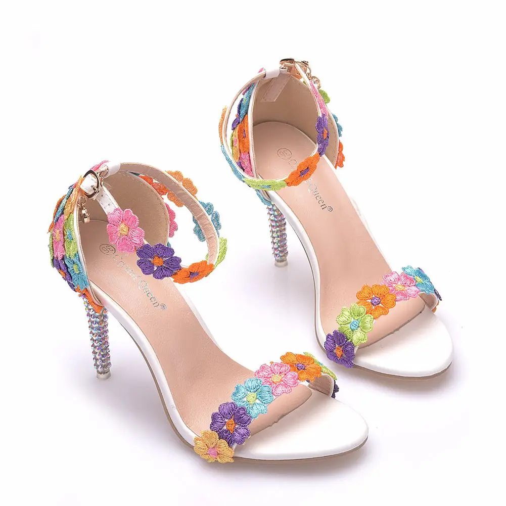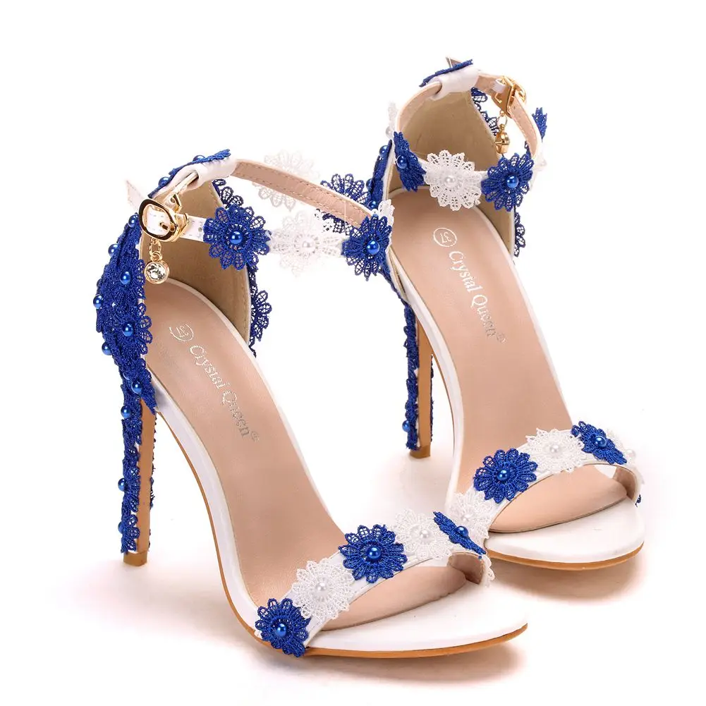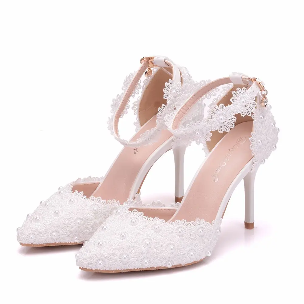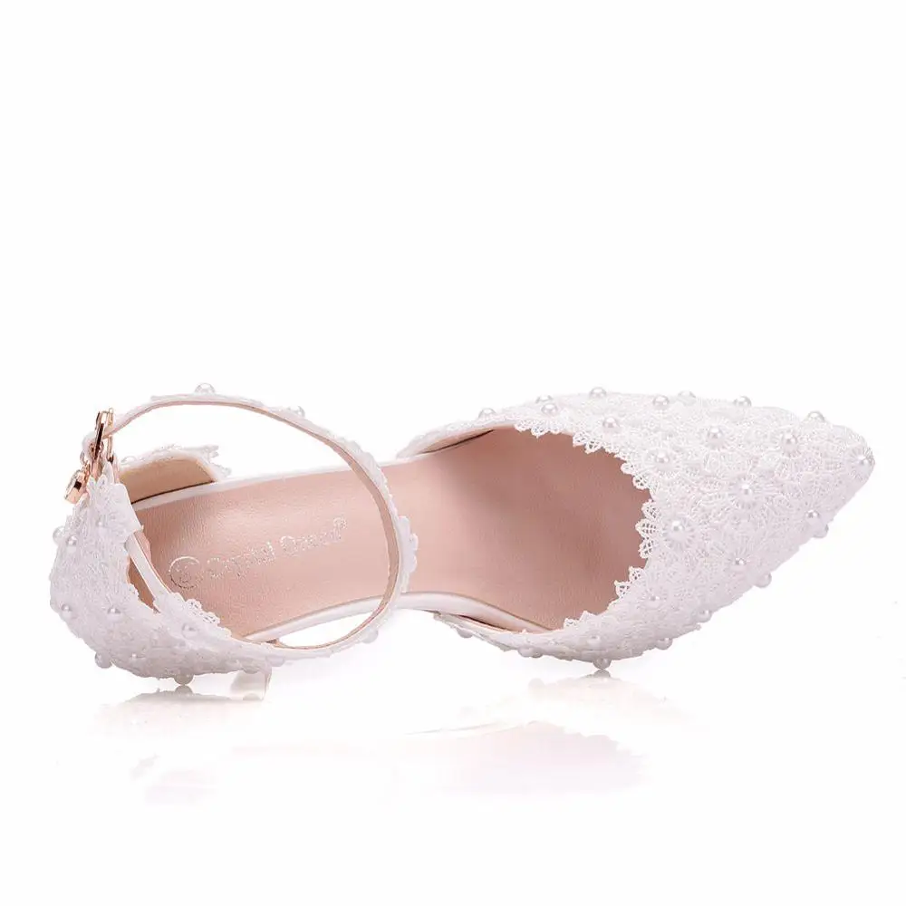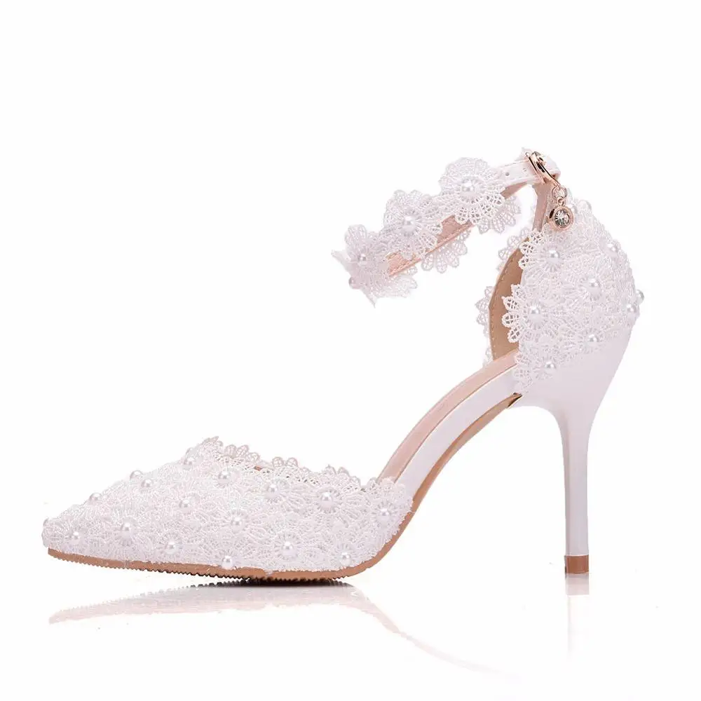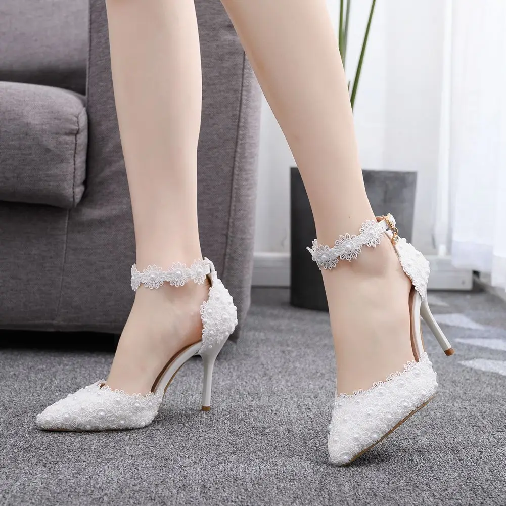 Босоножки женские на высоком каблуке, свадебные туфли с кружевными цветами, с ремешком на запястье, тонкие сандалии для подружки невесты, белые
