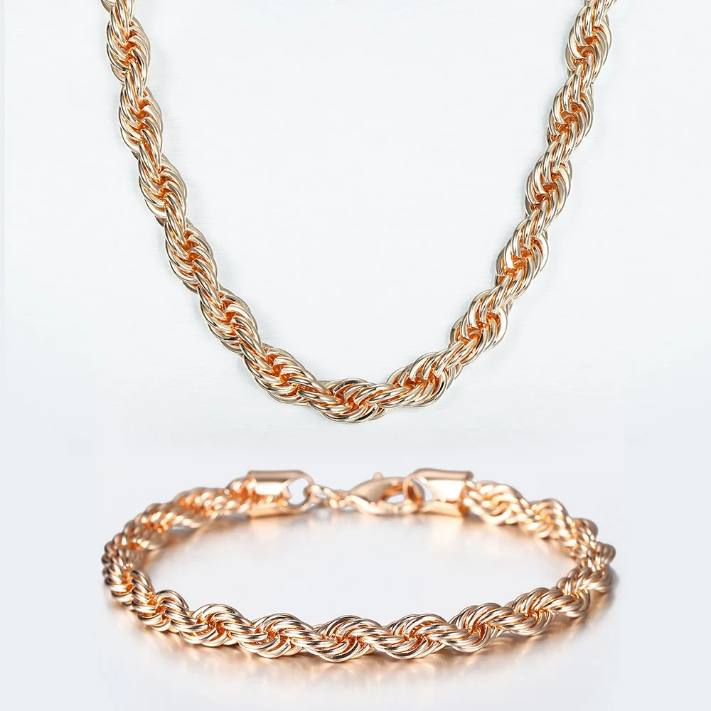 Комплект ювелирных изделий, 56 мм, из розового золота 585 пробы, крученая цепочка, ожерелье и браслет, для женщин и мужчин, для вечевечерние, свадьбы, лучшие подарки DCS19