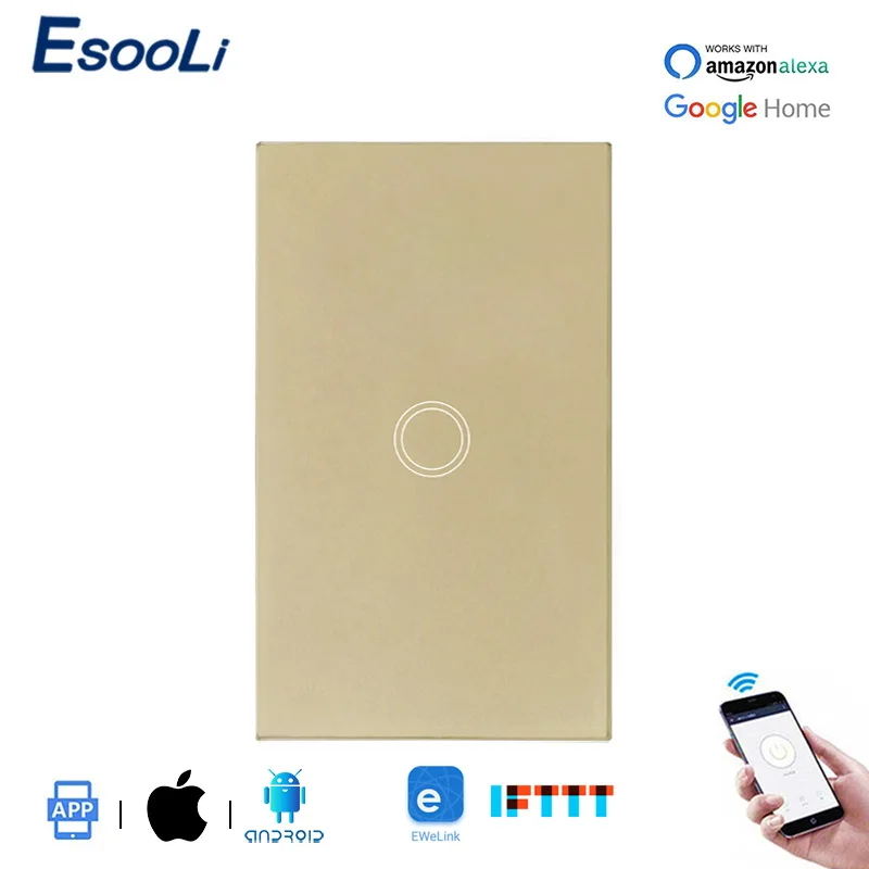 Настенный сенсорный выключатель EsooLi, стандарт США, 1 банда, управление Ewelink, не требуется нейтральный провод, умный светильник, одинарный переключатель