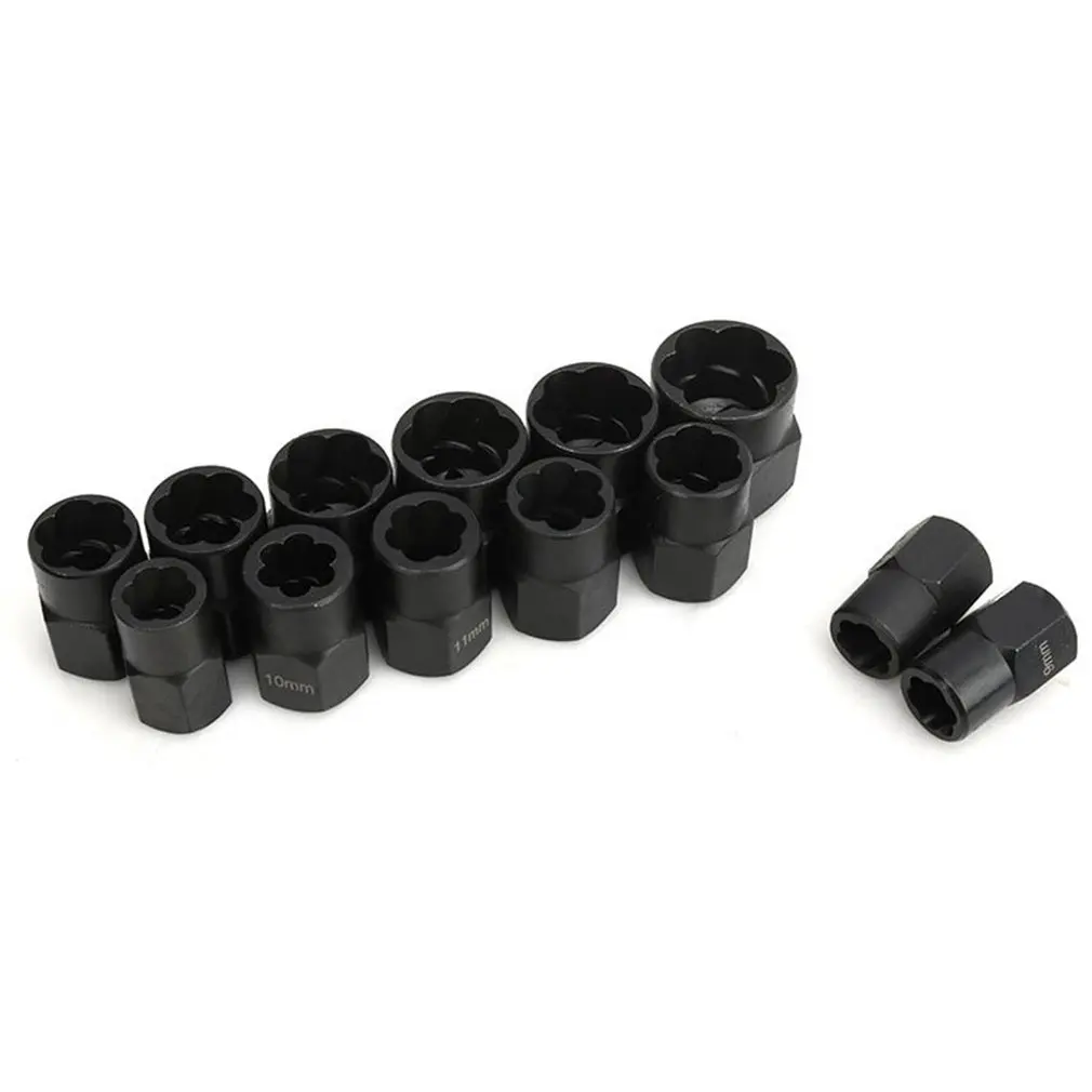 Особенности: Это набор из 10 прочных инструментов, помогающих удалить гайки, болты, головки винтов, шпильки и т. д. Подходит для головок размером 9, 10, 11, 12, 13, 14, 15, 16, 17 и 19 мм. Зубцы спиральной резки обеспечивают положительный захват для удаления закругленных или поврежденных болтов. Изготовлены из твердого сплава, обладают высокой прочностью и долговечностью. Описание: Эти инструменты можно управлять метрическим гаечным ключом или розеткой для быстрой работы. Все эти инструменты упакованы в чехол для удобного хранения и транспортировки. Характеристики: Материал: сплав Цвет: черный Посылка 1x13 шт./компл. набор для снятия гаек