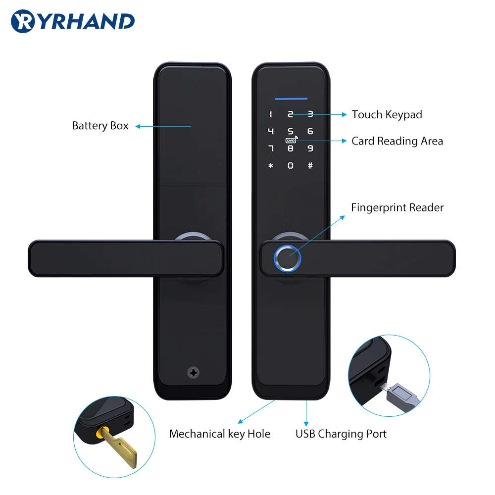 TTlock smart App/отпечаток пальца/Пароль/смарт-карта/разблокировка ключа Просмотр журналов доступа из приложения Поддерживает обычный открытый режим (свободный доступ) Другого Концевая фреза для вырезания гнезд для блокировки Размеры Английский Голос Волочения проволоки Панель Матовый чехол Толщина двери: 38-50 мм Универсальная как для правой, так и для левой двери