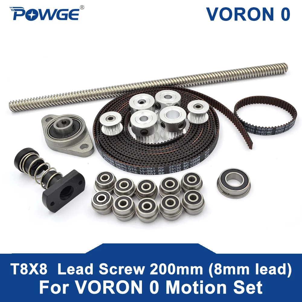 NEW VORON 0 MOTION Parts Set Include of GT2 Open Belt 6mm (2 meters)+(3pcs/lot GT2/2GT 20T pulley bore 5mm) and (1pcs/lot GT2/2GT 20T Pulley bore 8mm) + 2pcs/lot GT2 16T Toothed idler w/bearing (6mm wide) (3mm bore) + 1pcs/lot KFL08 pillow bearing 8mm ID +(20pcs F623 RS Bearing and 1pcs F688 RS Bearing )+(1pcs/lot GATES 110-2GT-6 RF GT2 Belt Loop (6mm wide)) + (1pcs/lot 8mm T8x2 Trapezoidal ACME Lead Screw w/ Brass Flange Nut 200mm) + (1pcs/lot T8 flange Nut 2mm Lead (slim kind not full round) 3D PRINTER