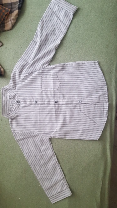 Рубашка с длинным рукавом, белая в полоску. Размер 3Т - указано на бирке 100/52. Думаю, на рост 100 будет немного коротковата. Мы специально заказали на вырост, сейчас носим 76-80. Рубашка сшита очень хорошо, заказали ещё черную в полоску.
