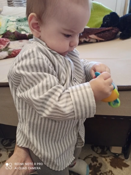 На 9-12 месяцев явно огромная. Ниток много торчит, но можно обрезать. В целом, материал напоминает тот, из которого раньше наматрасники были. Честно говоря, фото продавца дают совсем другое впечатление от рубашки, чем реальность. Посмотрю ещё после стирки, но ткань жестковата