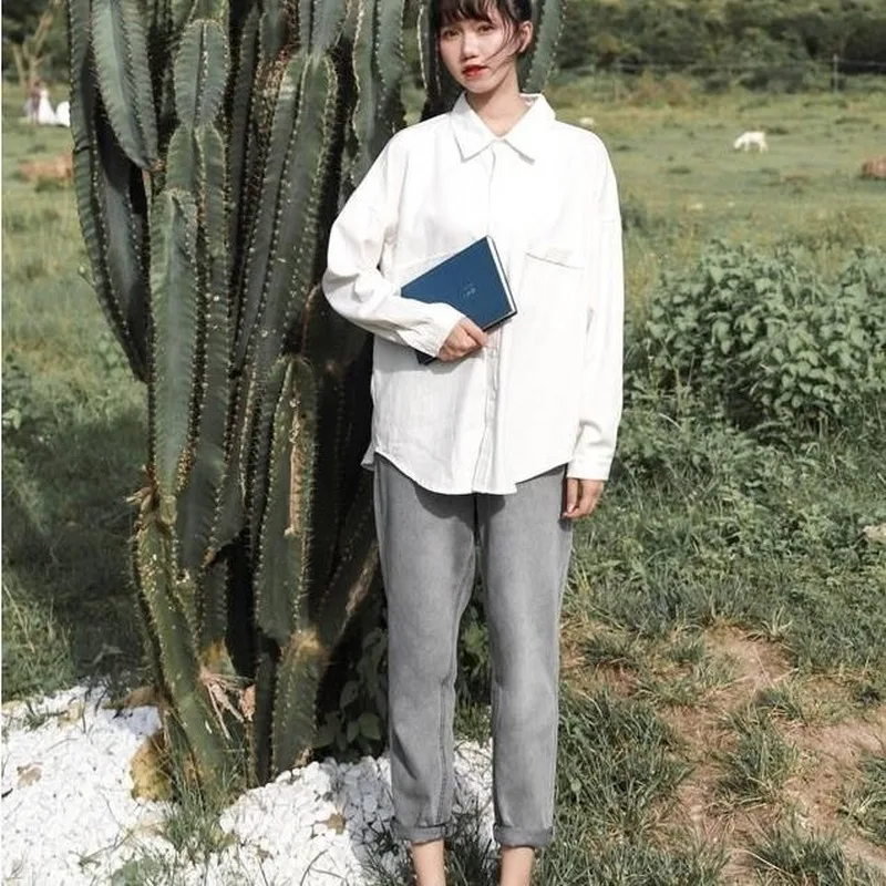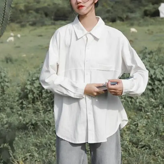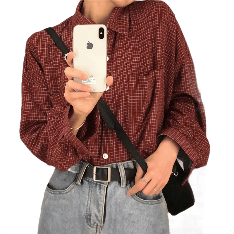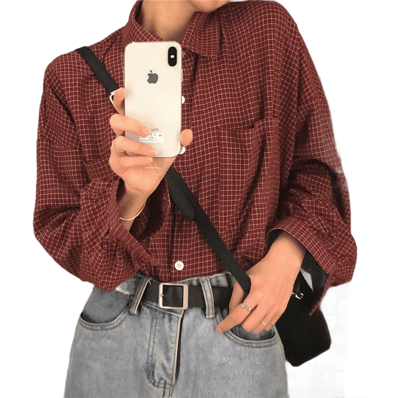 Блузка женская, с отложным воротником и длинными рукавами, клетчатая одежда, с карманами, в Корейском стиле, для студентов, в стиле ольччан
