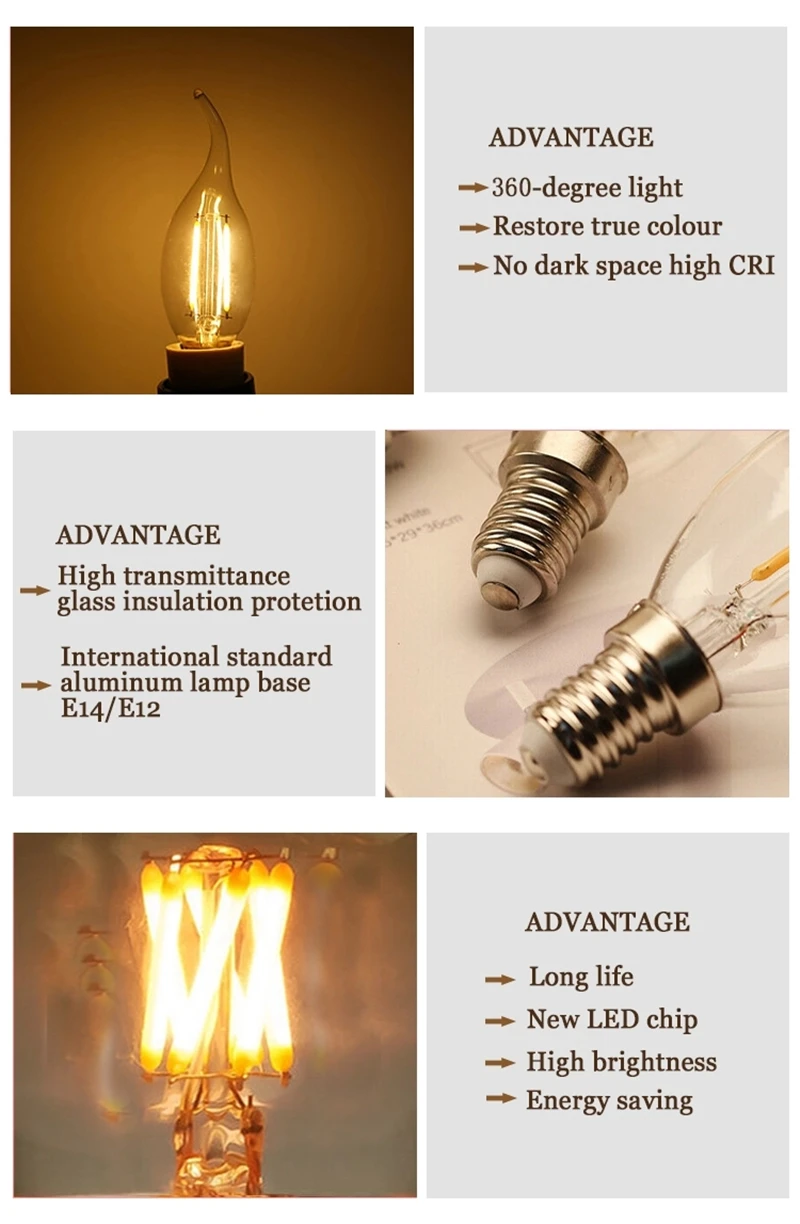 Особенности: Ультра-яркий светодиодный дизайн Светодиодный лампы, отсутствие УФ-и ИК-излучения. Длительный срок службы, высокая световая эффективность. Энергосбережение, низкое тепло и низкое энергопотребление. Большое снижение эмиссии углерода, экологически чистый. С традиционным дизайном лампы накаливания, его легко принять простым людям. При заполнении специальным газом тепло внутри обработанной вакуумной лампы накаливания может быть эффективно исключено. С углом луча 360 °, лампа накаливания может выдавать свет всенаправленный. Использование IC постоянного тока драйвера, лампа накаливания обладает стабильной производительностью и более длительным сроком службы Не содержит свинец, ртуть и другие элементы загрязнения. Подходит для залов, баров, офиса или домашнего использования.