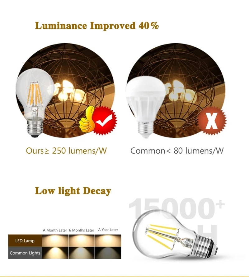 Особенности: Ультра-яркий светодиодный дизайн Светодиодный светильник, без VU и ИК-излучения. Длительный срок службы, высокая светоотдача. Энергосбережение, низкое тепло и низкое энергопотребление. Отличное снижение выбросов углерода, экологически чистый. С традиционным дизайном лампы накаливания, он может быть легко принят обычными людьми. Заполненный специальным газом, тепло внутри обрабатываемой вакуумной лампы накаливания может быть эффективно исключено. С углом луча 360 ° лампа накаливания может выдавать светильник всенаправленный. Принимая драйвер постоянного тока IC, лампа накаливания обладает стабильной производительностью и более длительным сроком службы Не содержит свинца, ртути и других элементов загрязнения. Подходит для залов, баров, офиса или дома.