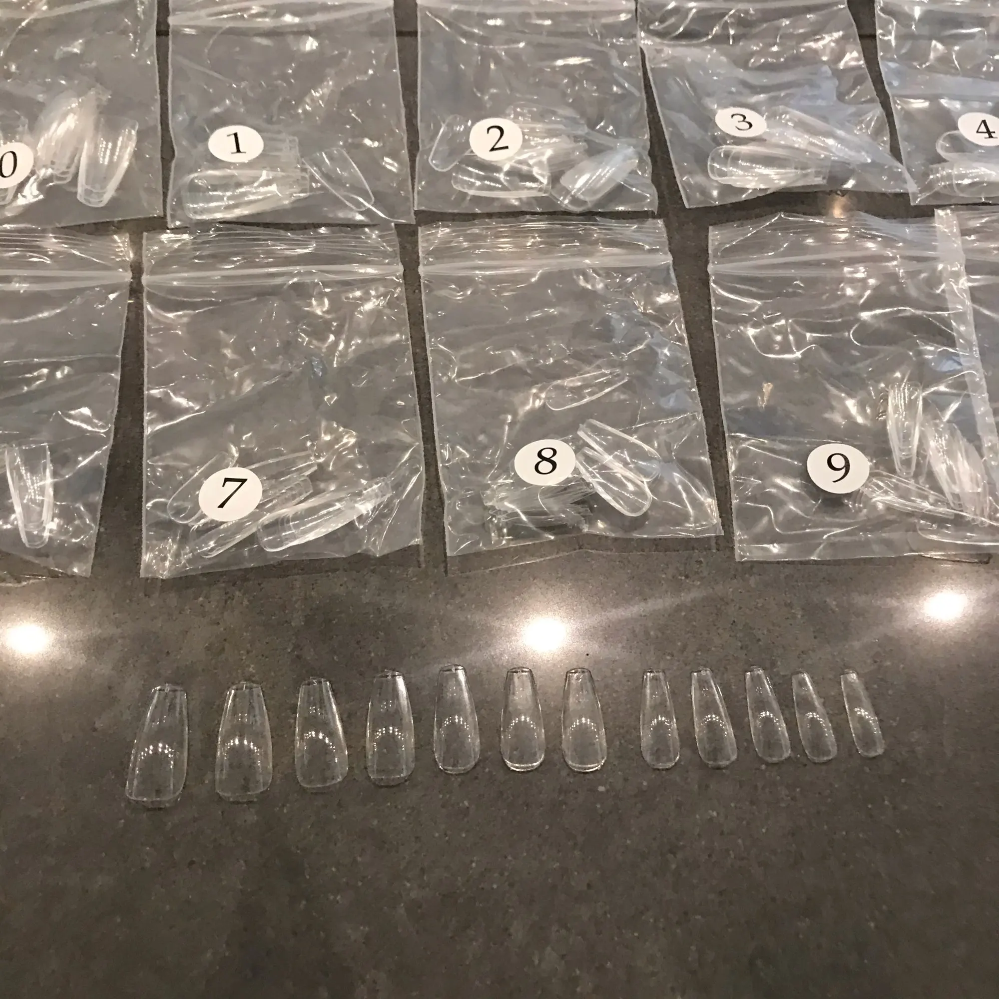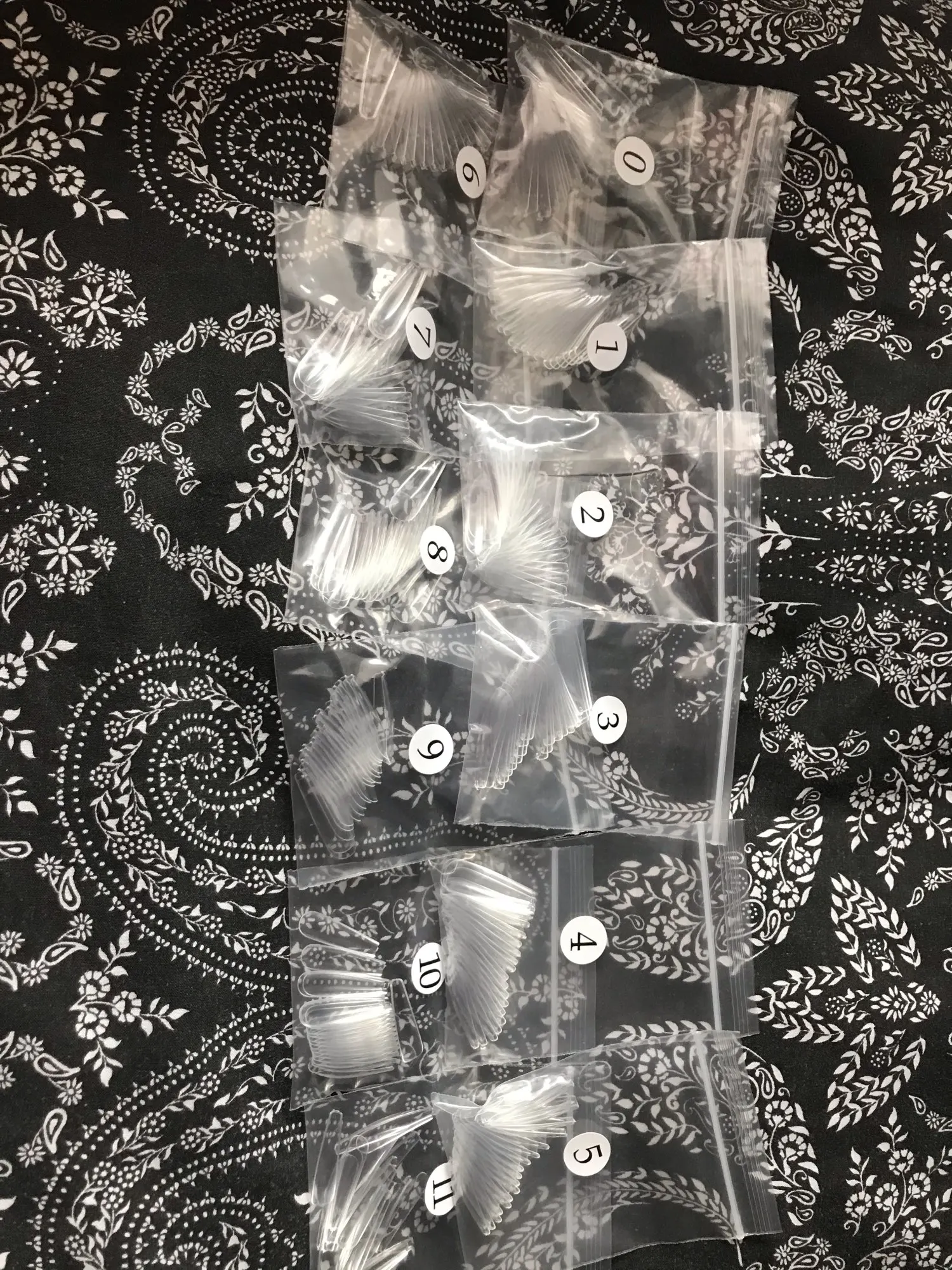На следующих фотографиях они только на вершине, чтобы попробовать их, как только я сделаю дизайн, и я действительно придерживаюсь их, я прокомментирую дополнительно. Эти наконечники действительно великолепны и сделаны из качественного пластика, они поставляются в разных размерах от 0 до 11 (в каждой сумке приходят количество 20 наконечников по размеру). Они имеют естественную структуру, с изогнутой каплей. Я бы назвал немного свободным краем, но в остальном. Они студенты. 100% рекомендуется (особенно для нажатия ногтей)
