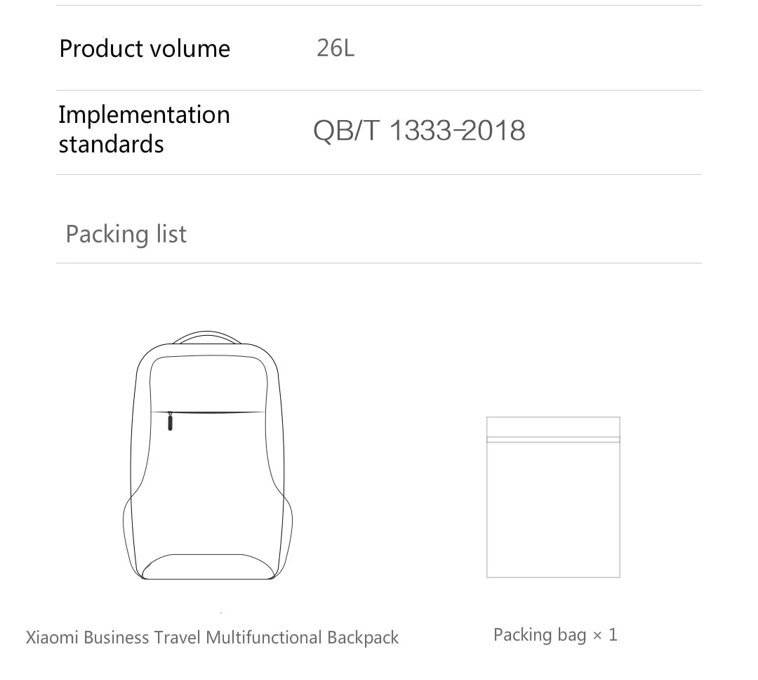 Бренд: Xiaomi Цвет: темно-серый Материал: полиэстер Объем: 26 л Уровень воды: уровень-4 суточный срок службы Водонепроницаемость Вес изделия: прибл. 930 г/32,80 унции Размер изделия: ок. 44,5*32,5*18,0 см/17,52*12,80*7,09 Вес посылка: прибл. 1160 г/40,92 унции Размер посылка: ок. 40*28*13,0 см/15,75*11,02*5,12 дюймов