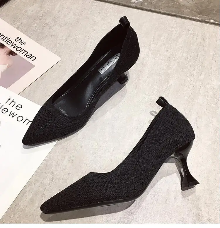 Женские трикотажные туфли EOEODOIT, коричневые туфли-лодочки на среднем каблуке, с острым носком, для офиса, повседневная обувь для весны и осени,