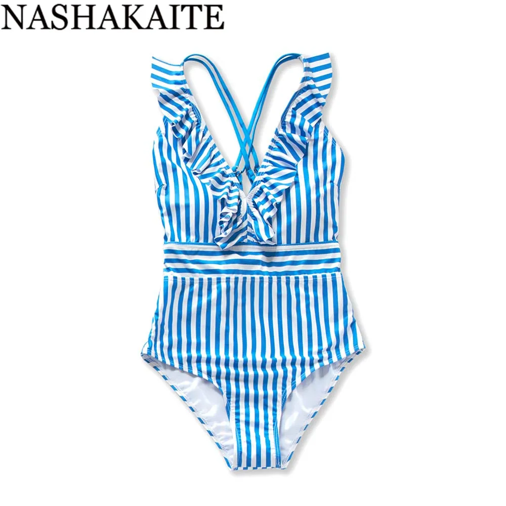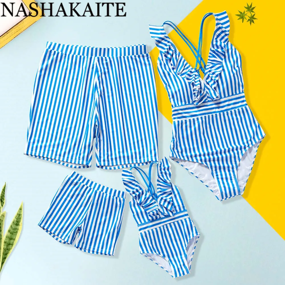 Семейный комплект NASHAKAITE, купальник в синюю полоску с глубоким V-образным вырезом и перекрестным вырезом Мама и я, летний купальник для мамы и дочки