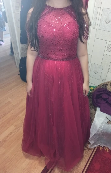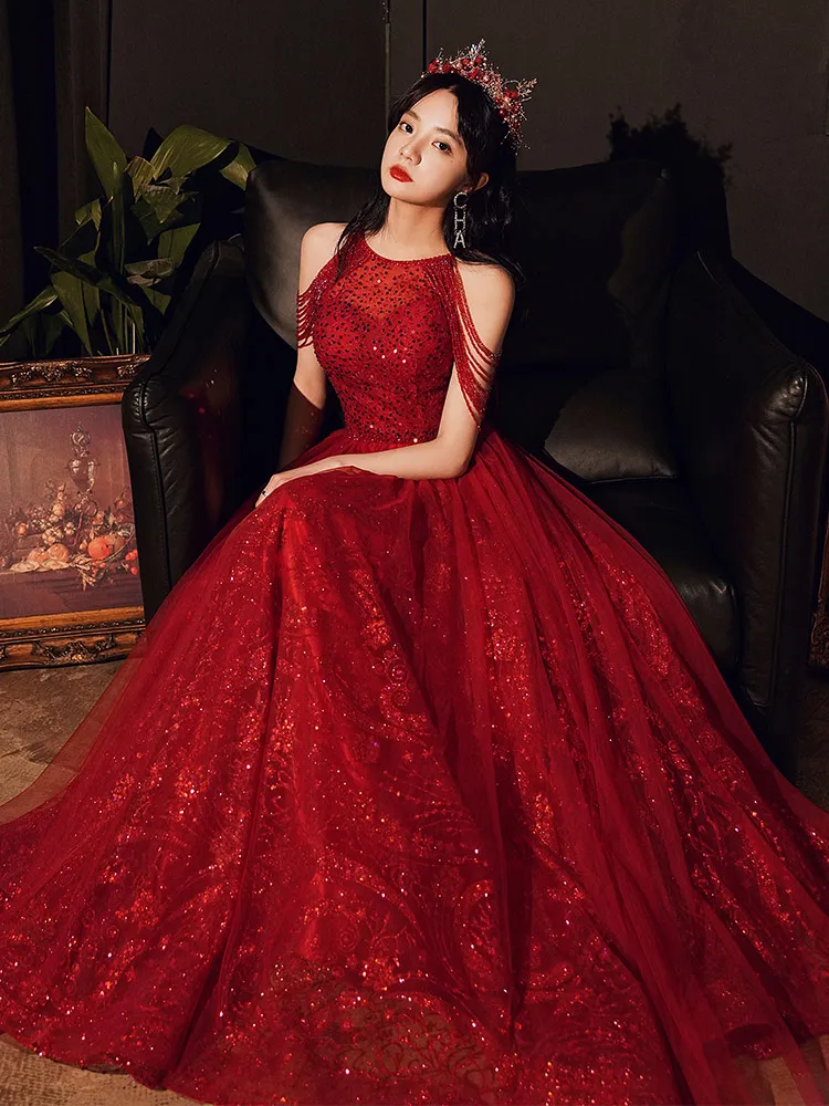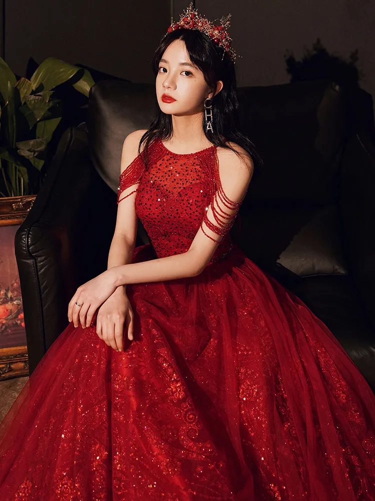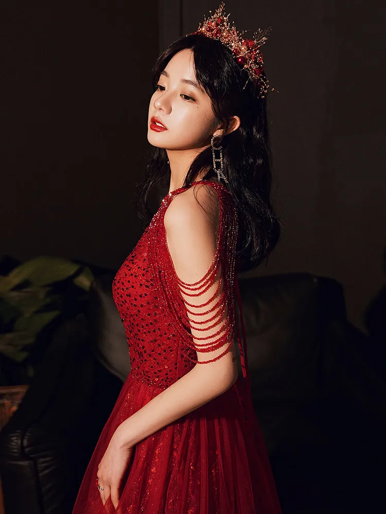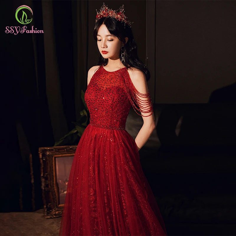 Женское платье с блестками SSYFashion, элегантное винно-красное платье с лямкой на шее, украшенное бисером, для выпускного вечера, вечернее платье, для банкета