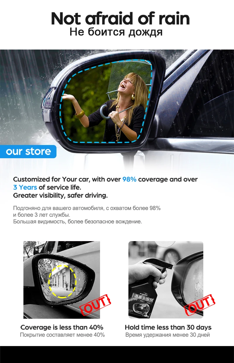 Описание Вы не можете ясно видеть, что происходит за зеркалом заднего вида вашего автомобиля в дождливые или туманные дни? Теперь с этой защитной пленкой с нанопокрытием все ваши неприятности будут устранены. Наша защитная пленка обладает функциями антизапотевания, Антибликовой, противотуманной, водонепроницаемой и непромокаемой. Когда идет дождь или туман, он может эффективно сделать ваше зрение яснее, лучше зрение и защитить безопасность вождения. Особенности -Защитная пленка высокой четкости, противотуманная, Антибликовая, противотуманная, водонепроницаемая и непромокаемая, эффективно делает ваше зрение более четким и лучше в дождливые или туманные дни, тем самым защищая вашу безопасность вождения -Также способен защитить ваши боковые зеркала заднего вида от нежелательных царапин, мазков, пыли и грязи. -Всегда держите зеркало заднего вида в чистоте. -Универсальный дизайн заднего вида зеркальная защитная пленка для автомобиля, внедорожника, грузовика, прицепа и т. Д., -Быстро и легко установить его непосредственно на зеркало заднего вида. 2 шт./компл.