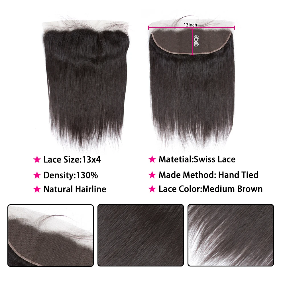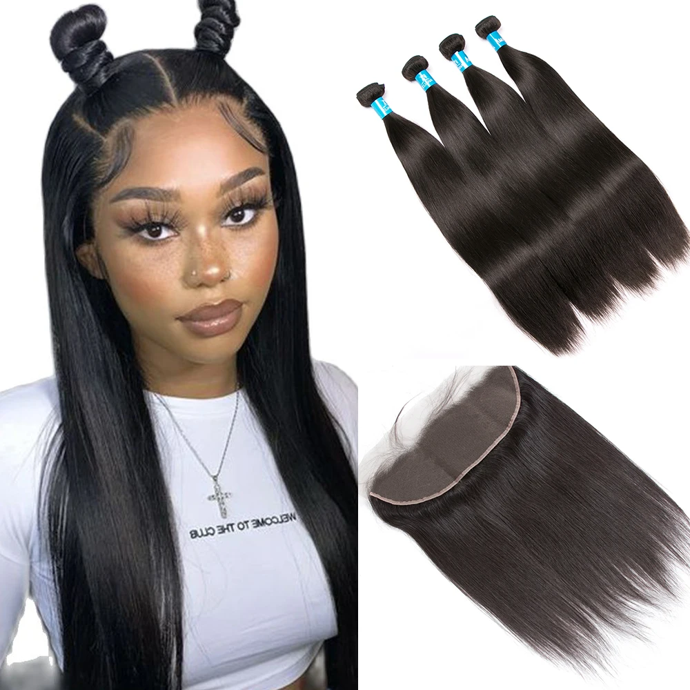 100% перуанские прямые пряди волос с фронтальной 13*4 Remy закрытие натуральный цвет пряди человеческих волос с закрытием