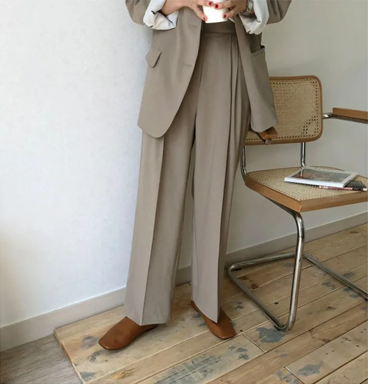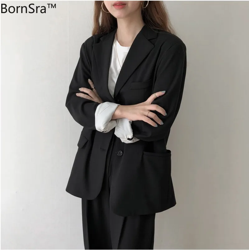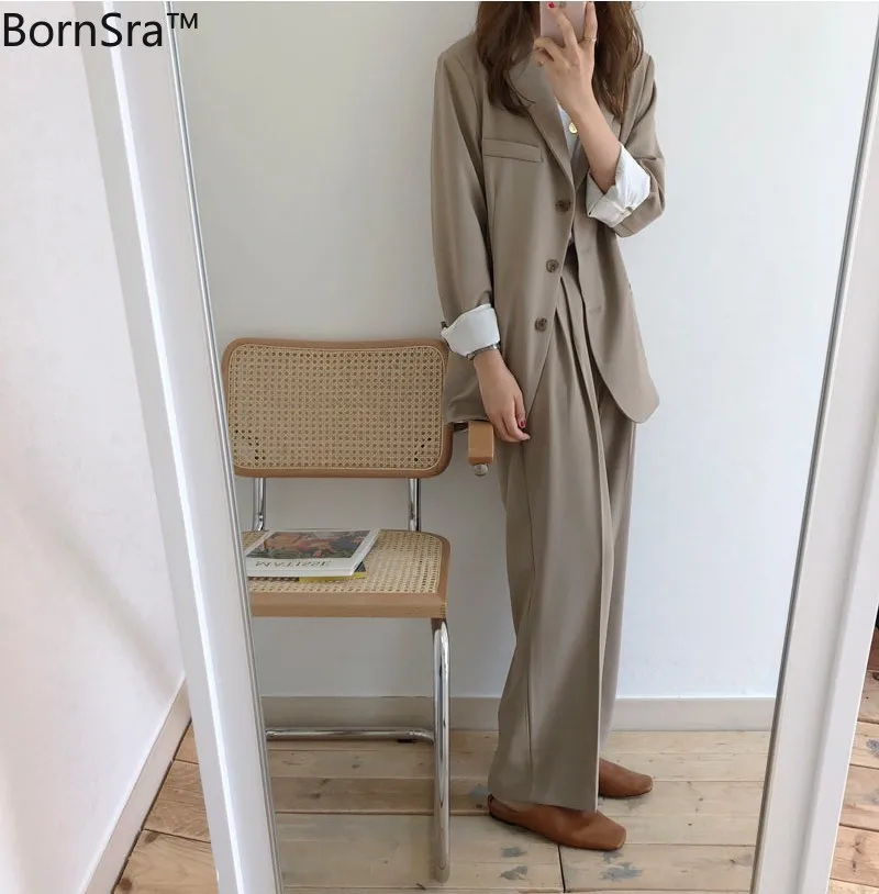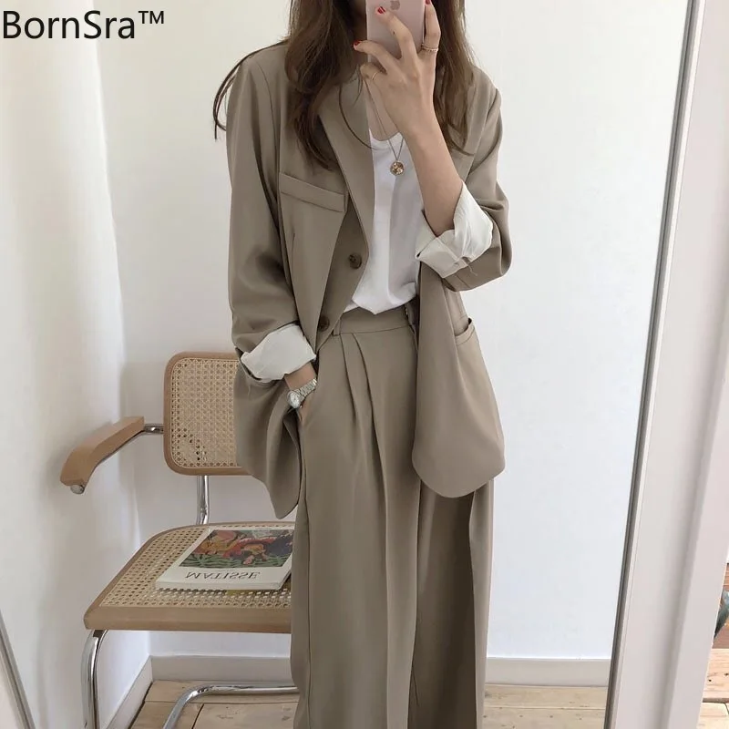 BornSra Свободный Повседневный костюм куртка + драпировка с высокой талией широкие брюки костюм