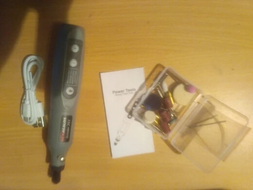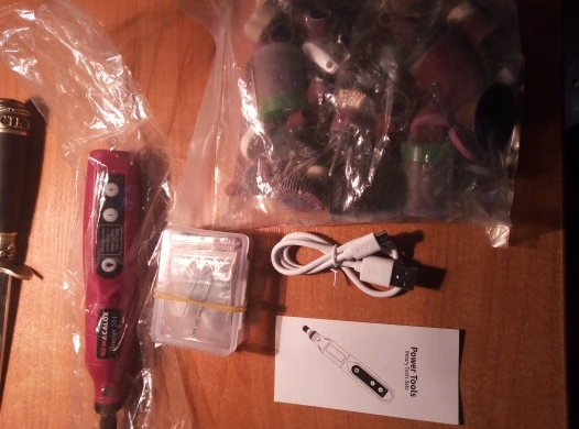 Доставка в Киев всего за две недели. Комплектация, как обещано, коробочка родная. Пришло немножко заряженным, заработало сразу. Фрез много разных, но просто в пакете, кучей. Поставил на зарядку. Вот так, без первичного разряжания, заряжалось 3 часа током в 300 мА. Причем, если включить - тоже потребляет с зарядки 300 мА. Удивительно! ) Зарядку показывает одним огоньком. Когда заряжен, огонек из красного становится зеленым. Все рабочее, красивое и удобное. Сначала думал, что неудобно наращивать обороты плюсиком постепенно, с минимума. Оказалось, если выключенному нажать минус - включается сразу на максимуме: переключение кнопок закольцовано! Плюс - вверх по кругу, минус - вниз по кругу. В общем отличный инструмент для мелких работ.