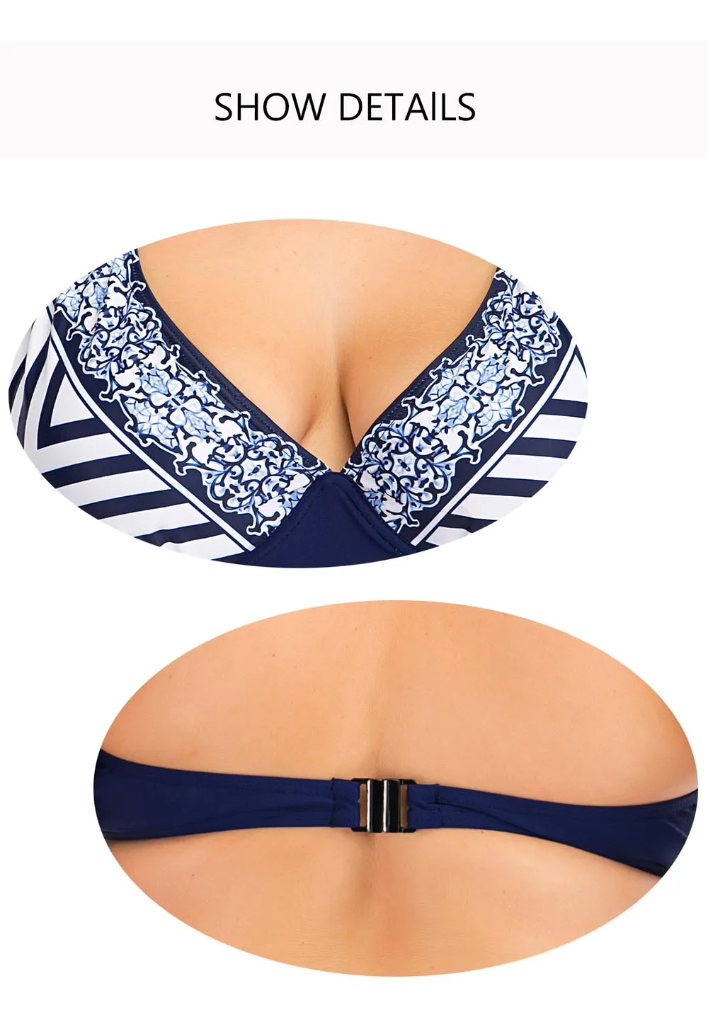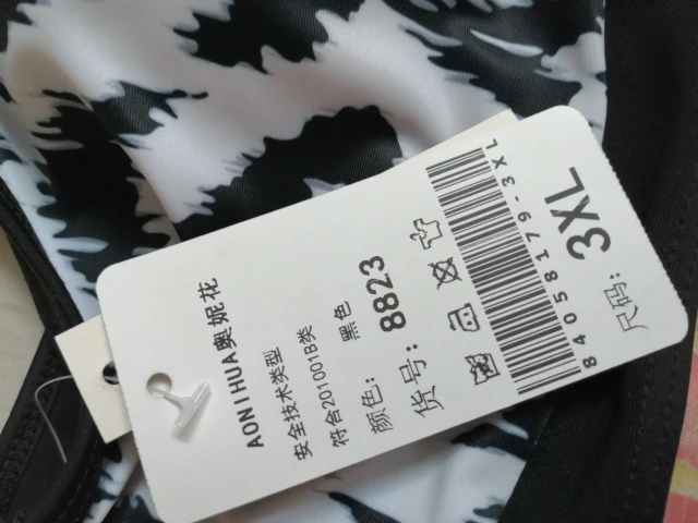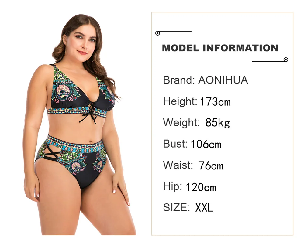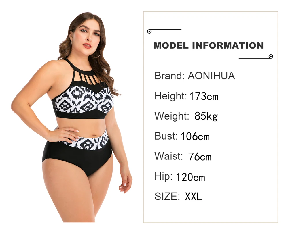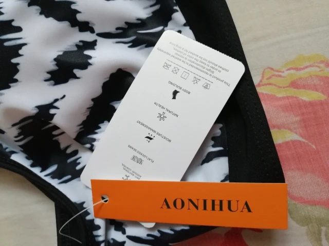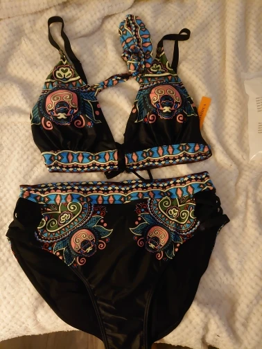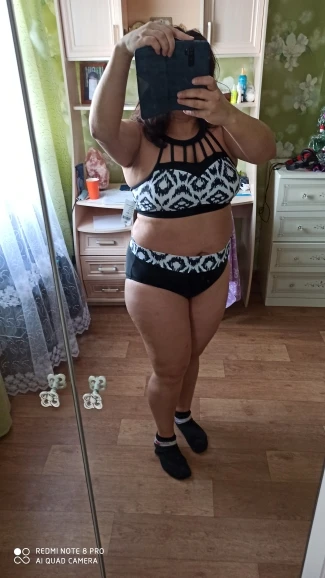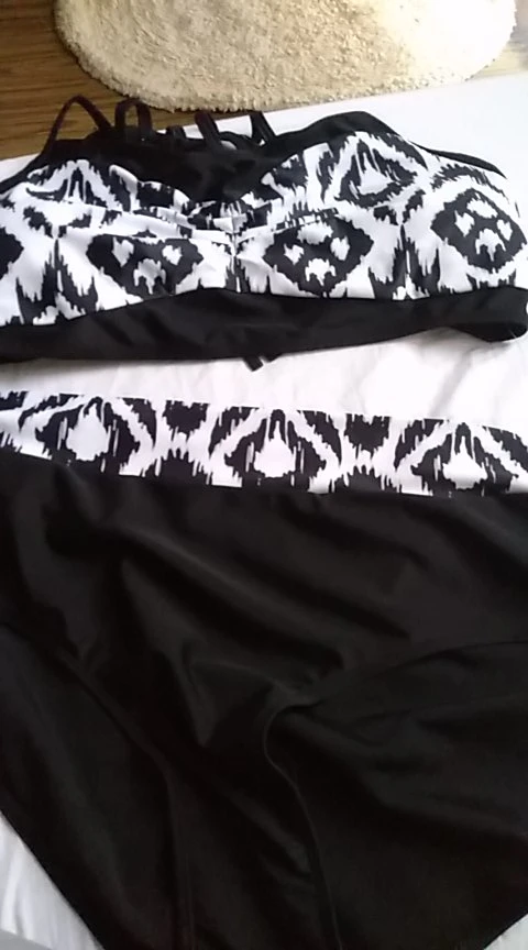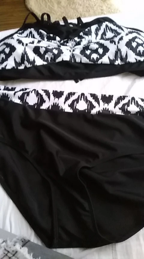 Красивый купальник. Талия подходит для трусиков. Для 44, я получил 3xl. Верх белой ленты сзади немного великоват. Черный галстук сзади поворачивается, потому что слишком туго.