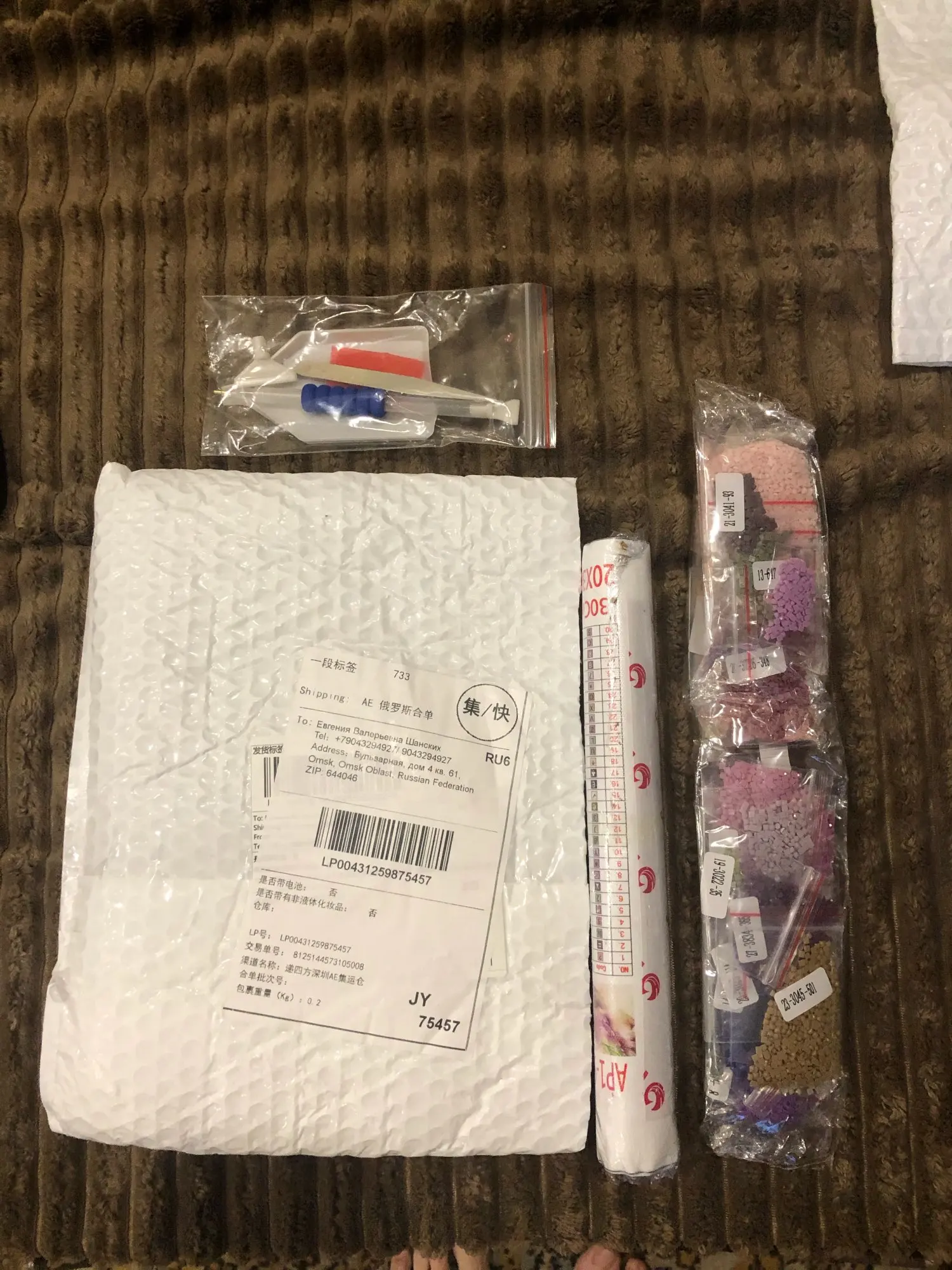 Заказ был сделан 25.01.2021. В Омск товар пришёл 16.03.2021. Упакован хорошо. Повреждений нет. В наличии намотанный на валик холст, кристаллики для мозаики и набор для крепления. Качество хорошее. По наличию будет понятно когда соберу картинку. Минус долгая доставка.