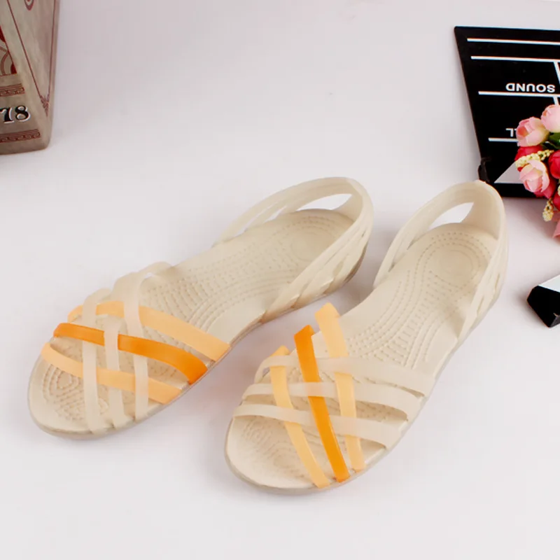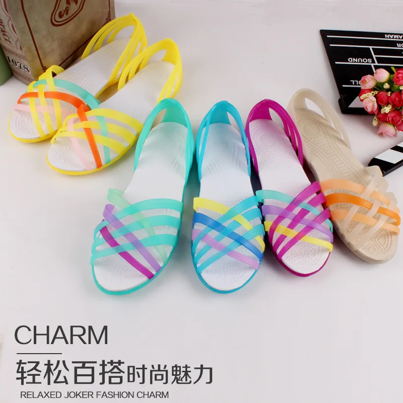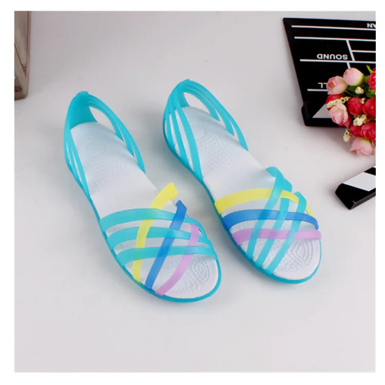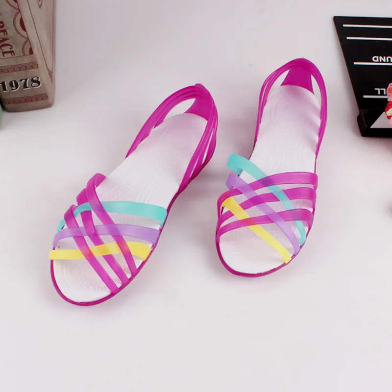 Женские радужные яркие сандалии-желе, пляжная обувь с открытым носком на плоской подошве, без застежки, Повседневная летняя обувь, lkj9
