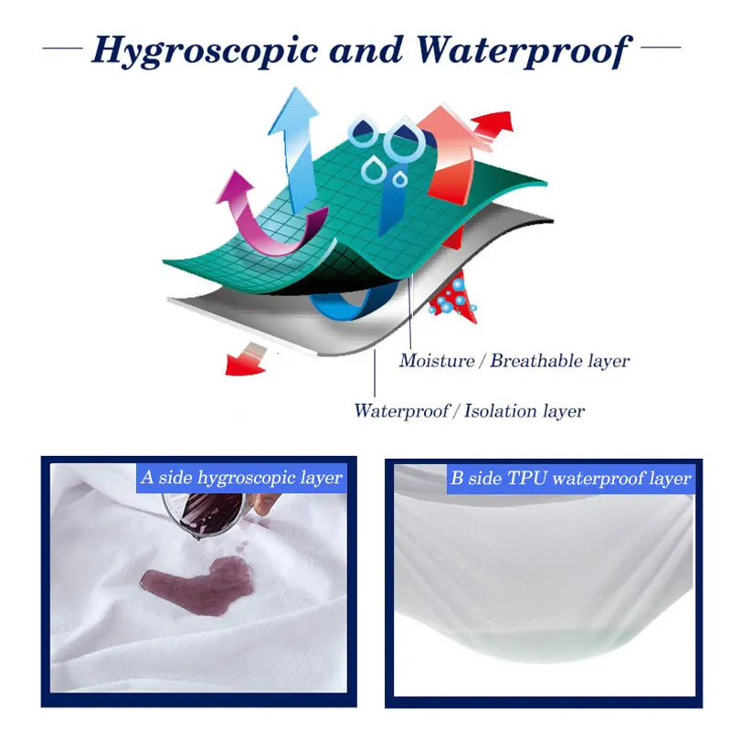 Это 80% хлопок-20% полиэстер махровая ткань смесь поверхности, которая обеспечивает комфорт и впитываемость. Он имеет специальную дышащую (полиуретановую) пленку на спине, которая позволяет теплу и влаге дышать, блокируя при этом бесmirch, жидкость, бактерии и другие гипервосприимчивые материалы от матраса кровати.