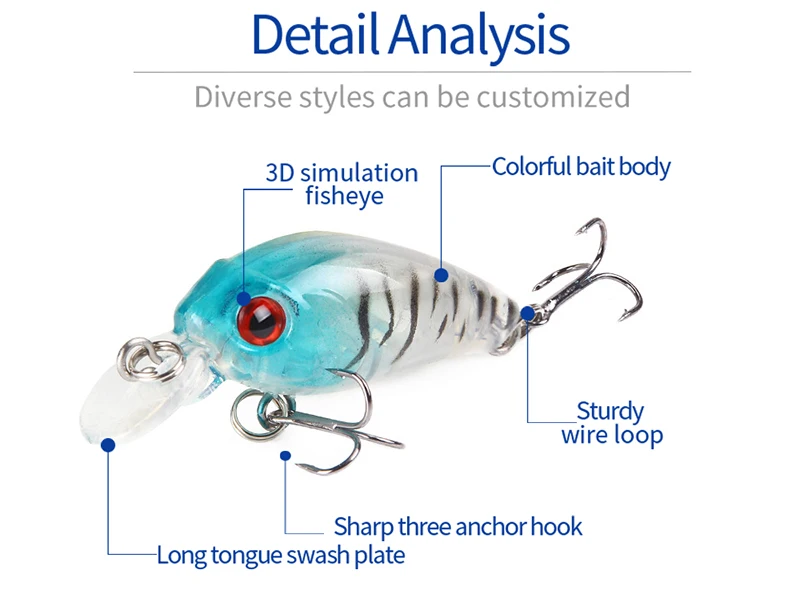 ●В корпусе находится стальной шарик, который может двигаться к хвосту при броске, увеличивая расстояние броска. Осанка на воздухе стабильная и ровная, и ее нелегко крутить, что хорошо для бросания. ●Он может отражать внешсветильник под полным углом, обладает отличным эффектом искушения света и подходит для различных условий воды. ●В корпусе есть несколько маленьких стальных шариков, которые будут издавать звук При перетаскивании, что сильно привлекает внимание рыбы. ●Изготовленные из АБС-пластика, прочные и прочные, противоударные, внутренние стальные шарики были протестированы высокоточными инструментами, чтобы в максимальной степени обеспечить стиль плавания каждой приманки.