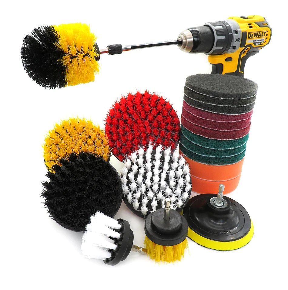 Щетка со средней щетиной желтого цвета 2,5 дюйма X1 2,5 дюймовая белая щетка с мягкой щетиной X1 Щетка со средней щетиной желтого цвета 3,5 дюйма X1 4-дюймовые щетки желтого и зеленого цвета со средней щетиной X2 4-дюймовая белая щетка с мягкой щетиной X1 5-дюймовая красная щетка с жесткой щетиной X1 Зеленые мочалки (жесткие) X3 Красные мочалки (умеренные) X3 Губки для чистки (мягкие) X3 Оранжевая Губка (очень мягкая) X2 Задник 4 дюйма X1 150 мм расширенное крепление X1 * Сверло в комплект не входит.