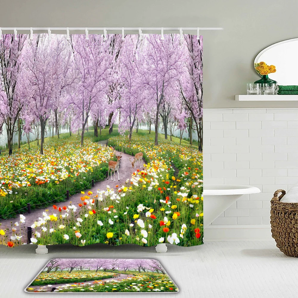 Идиллическая садовая занавеска для душа с цветами, лесным ландшафто...