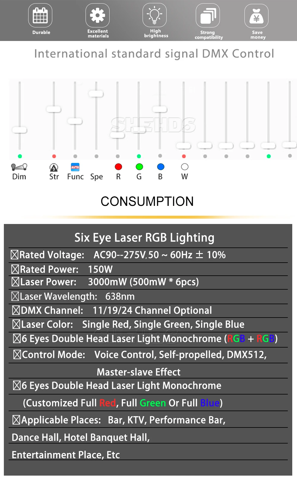 * Номинальное напряжение: AC90--275VV 50 ~ 60 Гц ± 10%* Номинальная мощность: 150 Вт* Источник лазера: полупроводниковый лазер насоса* Лазерная Модуляция: TTL* Длина волны лазера: 638нм* Мощность лазера: 3000 МВт (500 мВт * 6 шт.)* Цвет лазера: один красный, один зеленый, один синий* Лазерная система: Точная Шаговая Система сканирования двигателя, ось поворота Y 190 градусов, X-axis лазерная головка может качаться.* Лазерный эффект: производительность лазерного луча Skynet, лазерный эффект водной линии, лазерный стробоскопический эффект, светодиодный Эффект луча, стробоскопический эффект воды и т. д.* Режим управления: голосовое управление, самоходный, DMX512, эффект master-slave* DMX канал: 11/19/24 канал* Использование окружающей среды: в помещении* Применимые места: бар, КТВ, представление бар, танцевальный зал, Банкетный зал отеля, Развлекательное место и т. Д.* Рабочая температура: - 20 ° C ~ 45 ° C* Монохромный лазерный светильник с двумя головками для 6 глаз (на заказ красный, зеленый и синий)* 6 глаз двойной лазерный светильник монохромный (RGB + RGB)* Мощность лазера: 3000 МВт (500 мВт * 6 шт.)
