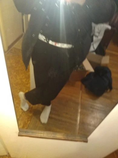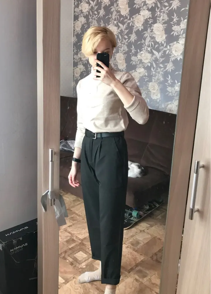 Брюки отлично сидят, хоть и мужские, но на бёдрах до 90см смотрятся очень хорошо 5 баллов