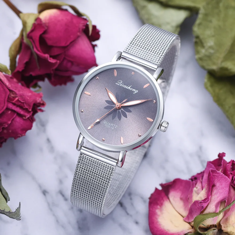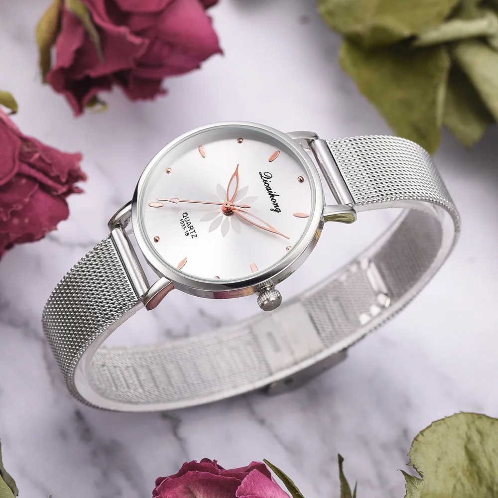 Часы наручные женские кварцевые с цветами, с металлическим браслетом
