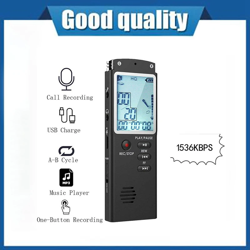Особенности:Функция записи одной кнопкой, просто нажмите REC, чтобы начать запись.Высокое качество MP3, WAV формат записи с емкостной аудиозаписью для более четкого звука.Поддержка записи телефона, функция повтора, автоматическое сохранение файлов с низким напряжением, функцией часов и внешним воспроизведением голосовых динамиков.С голосовым управлением, он будет автоматически записывать при прослушивании звука и пауза в противном случае.Внутренняя полимерная батарея большой емкости поддерживает запись в течение 720 минут.Спецификация:Тип товара: диктофонМатериал: АБС-пластикЦвет: черныйДля хранения Ёмкость: 8 / 16 / 32 ГБПамять: встроенная флэш-памятьМикрофон: всенаправленный конденсатор 360 градусов MICФормат записи: WAV /MP3Дисплей: ЖК-экранВремя записи: 720Интерфейс: USB 2,0Расстояние записи: 6-12 мПосылка включает в себя:1x диктофон1x наушники1x USB кабель1x микрофон1x аудио кабель1x телефонный кабель1 телефонная/записывающая распределительная коробка1x Руководство пользователя