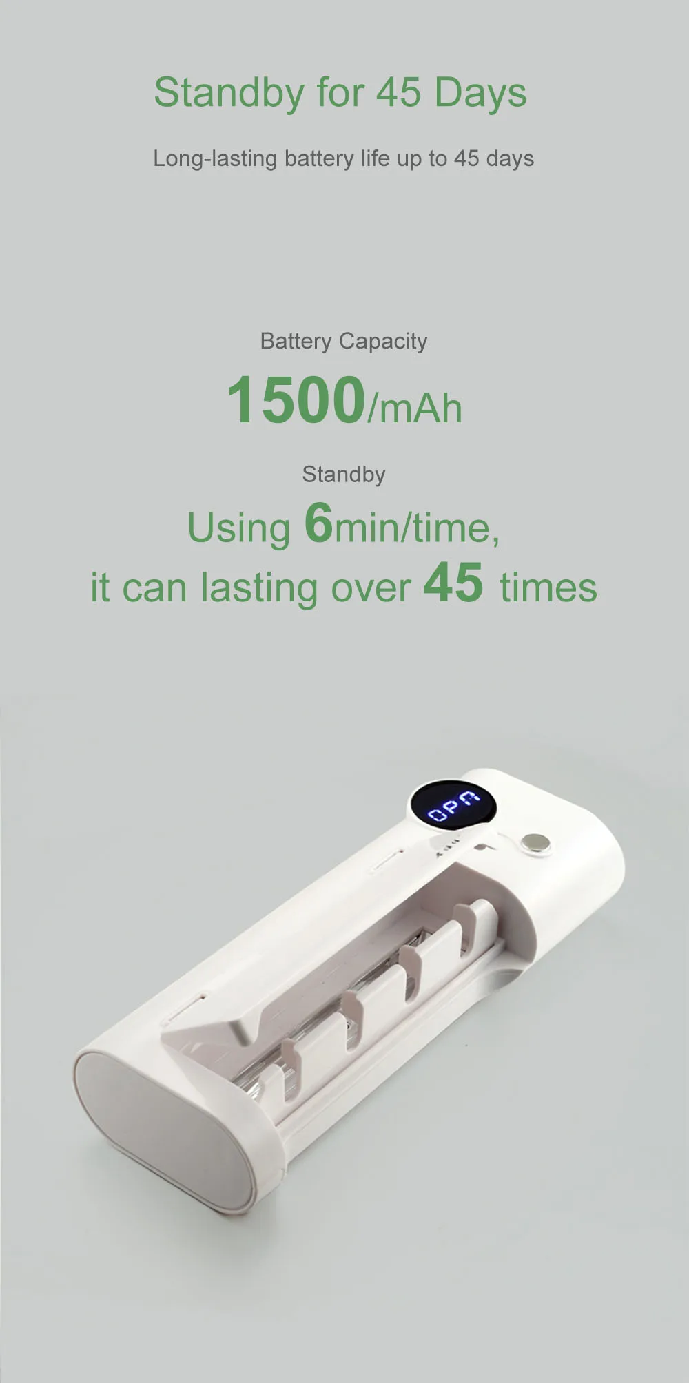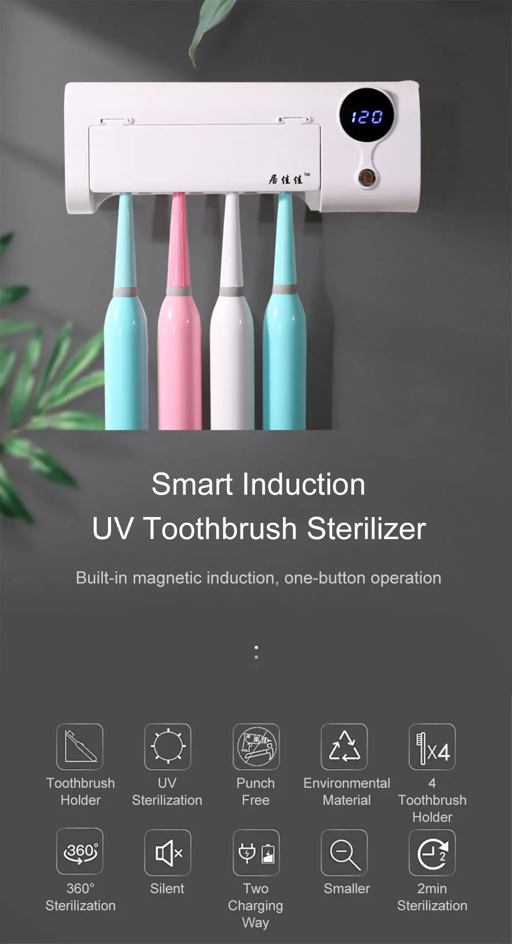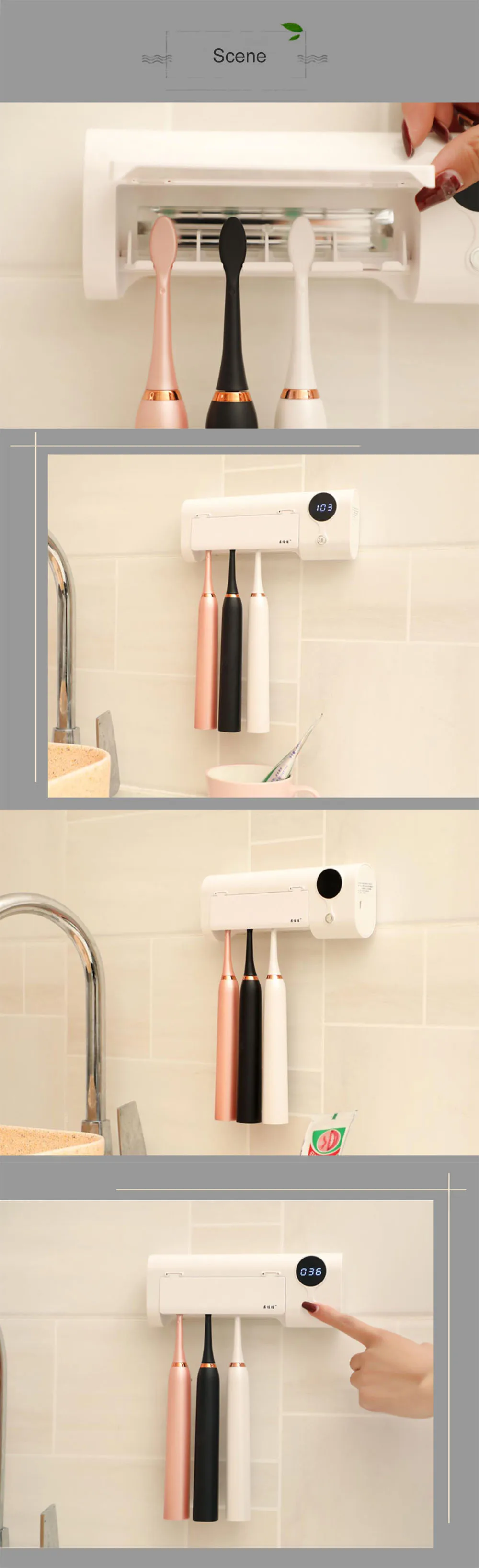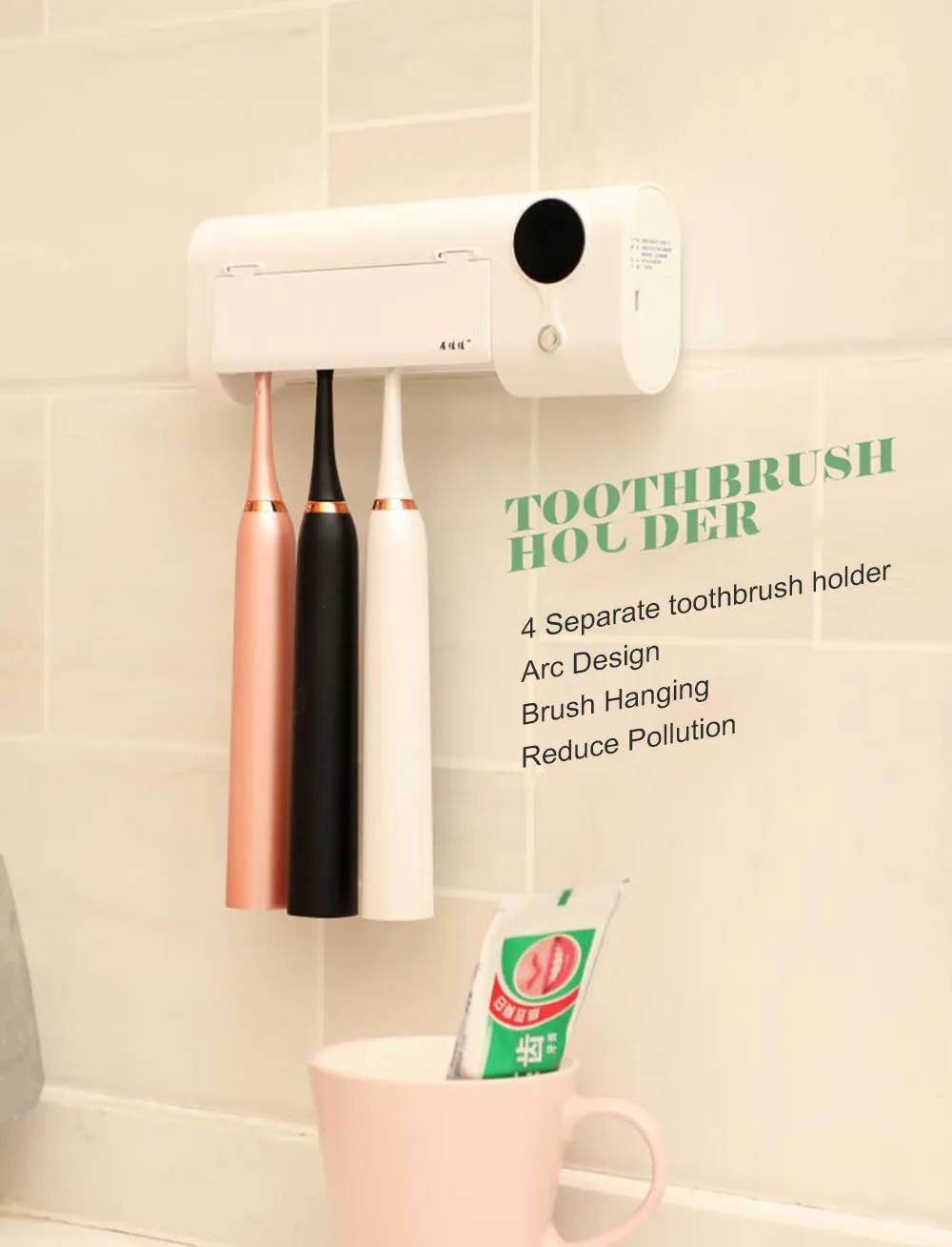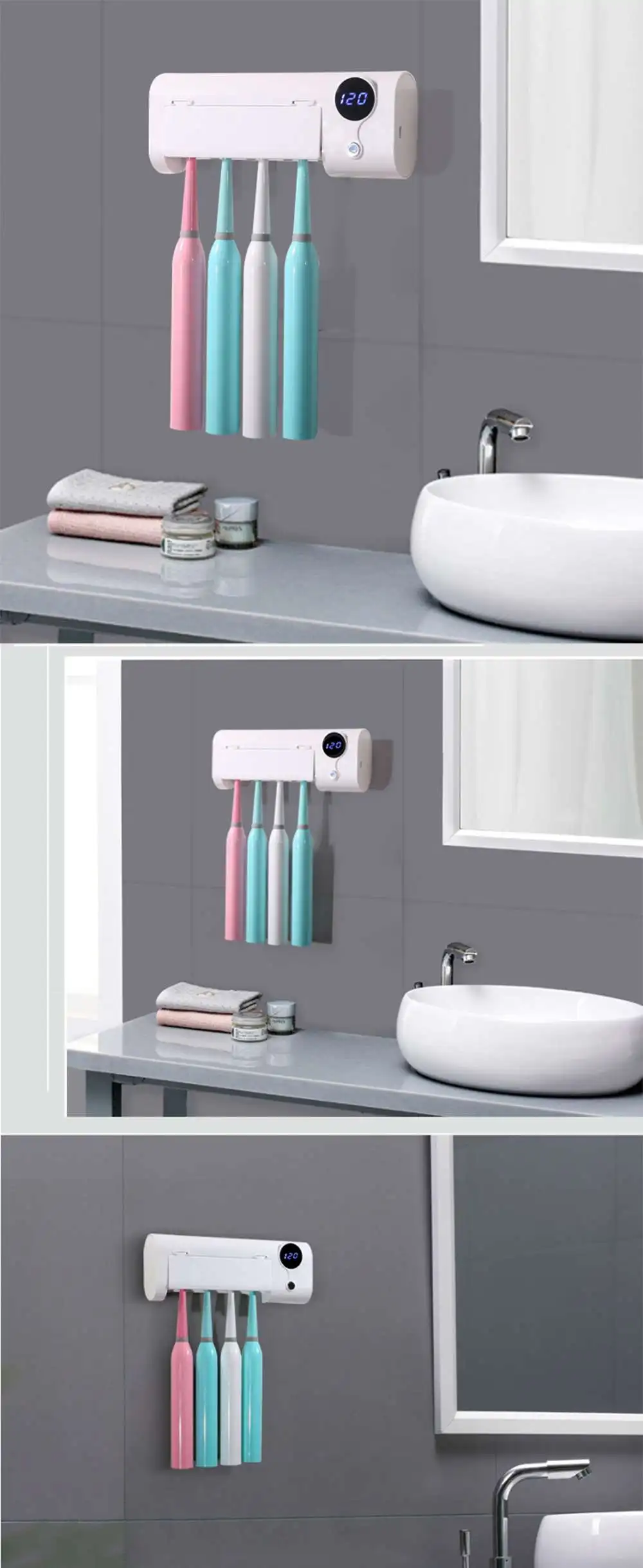 Основные характеристики УФ-стерилизатора антибактериальной зубной щетки:-Технология УФ-индукции, интеллектуальная стерилизация не повреждает кожу-Встроенный магнитный датчик, удобный дизайн, простое применение-4 независимых держателя для зубных щеток, научные круглые подвески для зубных щеток, уменьшают загрязнение-Одна зарядка, 45 дней автономной работы. Встроенный литиевый аккумулятор емкостью 1500 мАч, 45 дней автономной работы-Быстро и эффективно, уничтожение бактерий всего за 6 минут