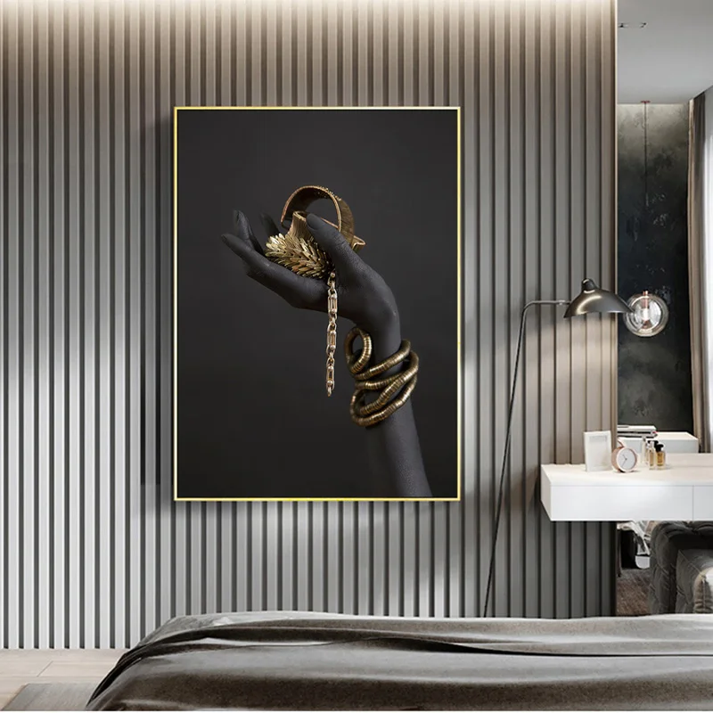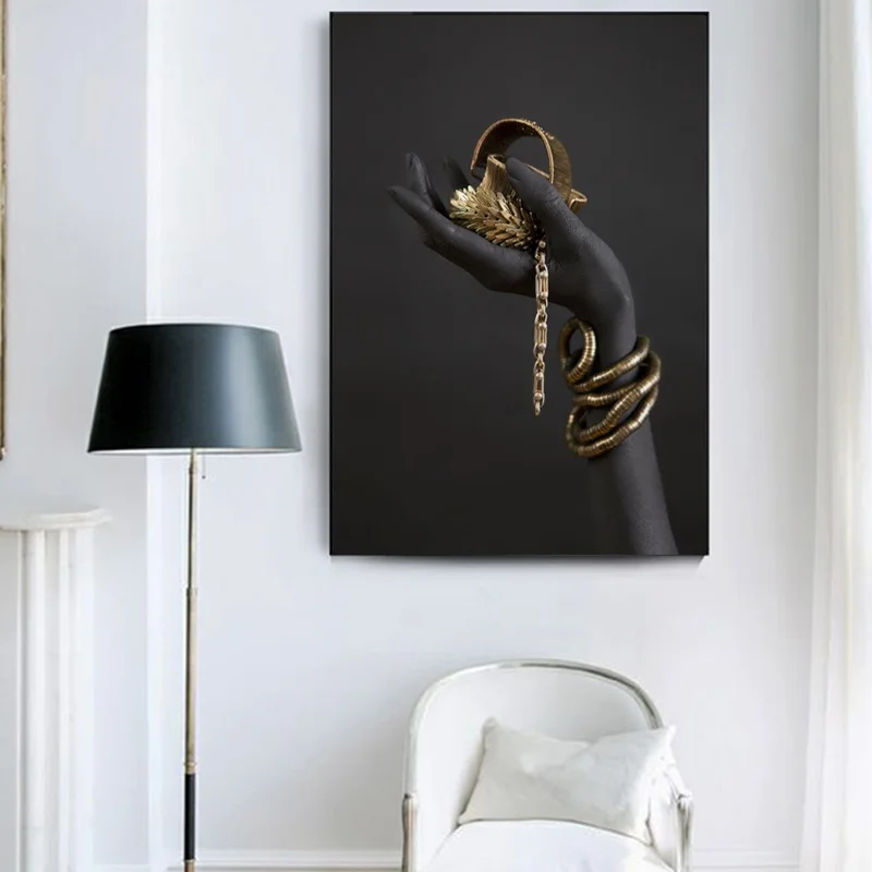 Настенные художественные холщовые картины Черная Женская Ручная работа с золотыми ювелирными изделиями постеры и принты на стене художественное изображение комнаты домашний дизайн