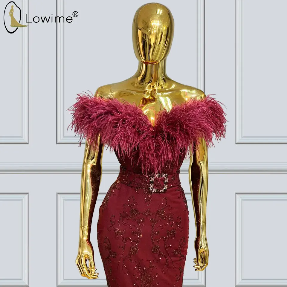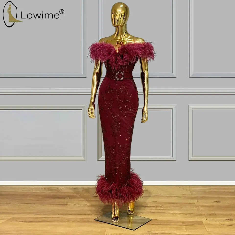 Женское вечернее платье-Русалка Abendkleider, Бордовое платье с открытыми плечами, с перьями, длиной до щиколотки, для выпускного вечера
