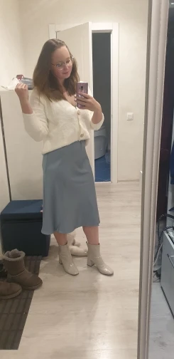 Платье классное. Но на фигуру груша как у меня, есть нюанс. Я взяла L ( у меня 90/65/105), оно в самый раз в бёдрах, а вот в талии и груди великовато. Я немного ушила и теперь все гуд. Мой рост 158. Длинновато, но не критично, и, конечно, длину убрать не проблема. Ткань приятная, красивая, очень красивый цвет. Серовато-голубой