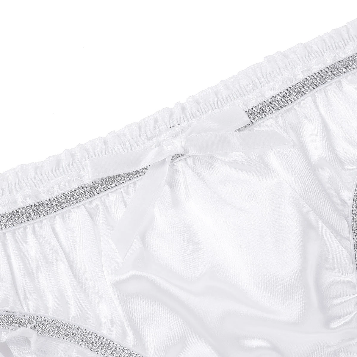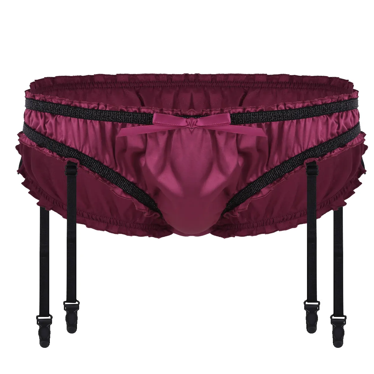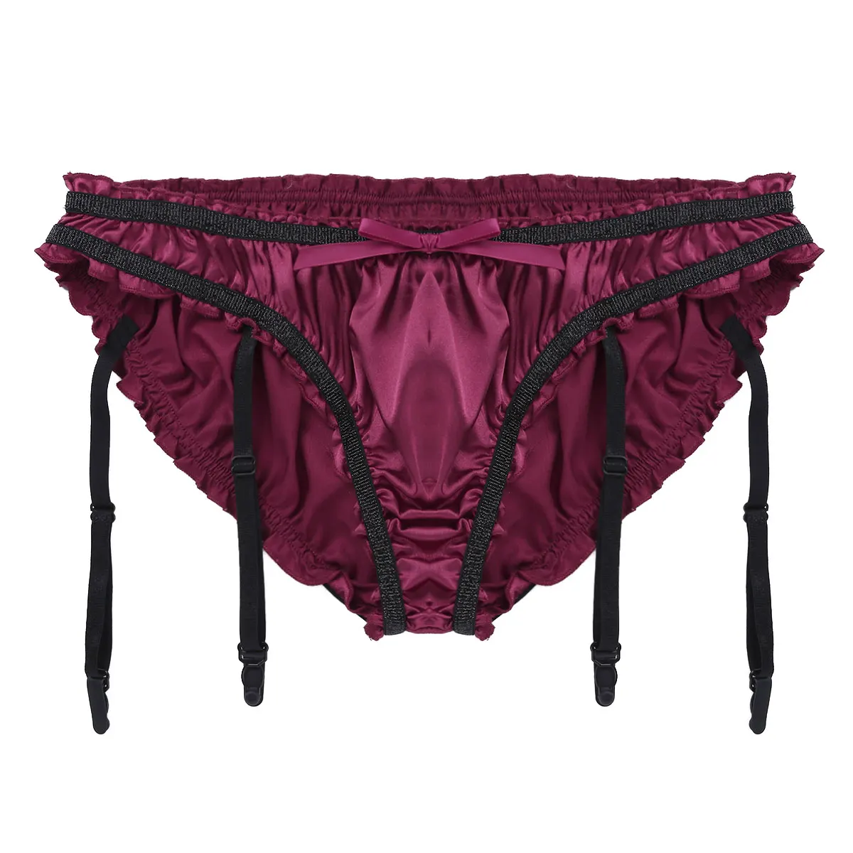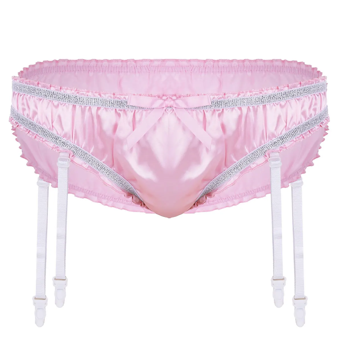 Особенности: Мужское нижнее белье с треугольными трусами sissy, гладкая и эластичная ткань из спандекса. Удобный эластичный пояс, дизайн с оборками, отделка блестящими линиями. Полный крой, мягкие и удобные в носке, с 4 подвязками для удержания чулок. Отлично подходит для ночного белья, удивления перед сном или для самостоятельного наслаждения. Пожалуйста, внимательно проверьте размер перед покупкой, рекомендуется ручная стирка в холодной воде.
