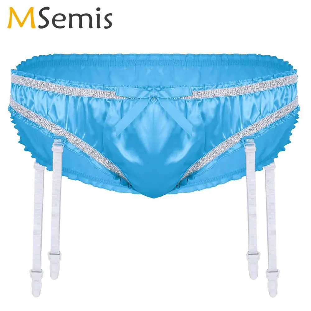 Сексуальные мужские Трусики-бикини Wetlook, атласные треугольные Трусики-бикини с оборками, нижнее белье с подвязками для геев, эротический бандаж