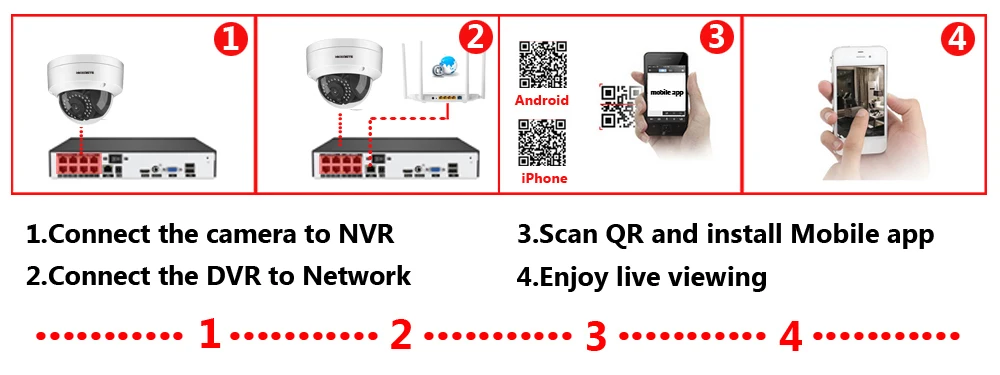 Простая настройка, всего 4 шага для просмотра на мобильный телефон,Просмотр видео в режиме реального времени в системе из любого места и в любое время с помощью смартфона, стола или ПК с передовой технологией P2P, вы можете получить удаленный доступ к вашей системе в течение нескольких минут или меньше, нет необходимости в переадресации, удаленный доступ никогда не был таким простым!