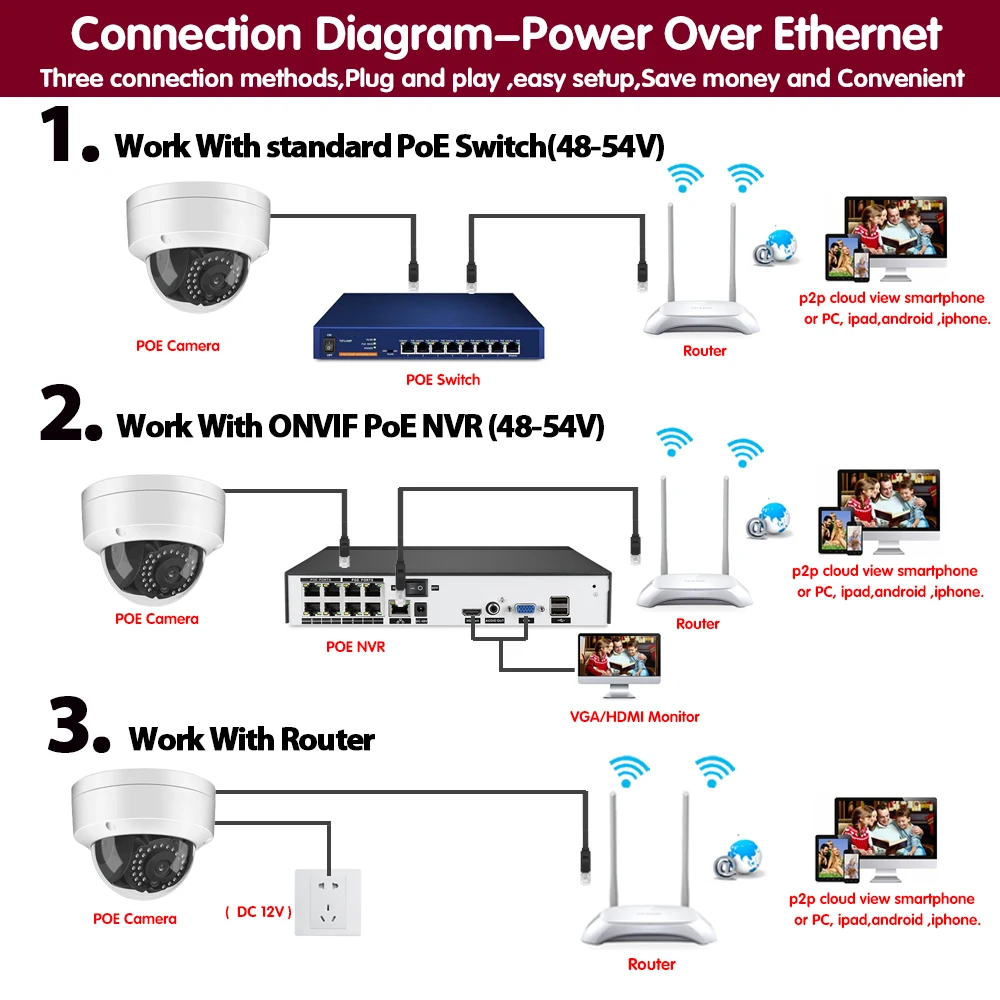 Нет дополнительных кабелей питания или адаптеров, просто подключив ip-камеру к NVR с помощью одного кабеля, вы можете легко завершить установку без знания о компьютере или сети и начать наслаждаться супер простым мониторингом среди вашего смартфона, планшета или ПК.