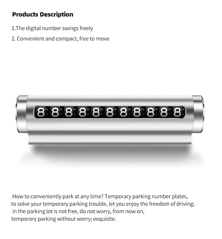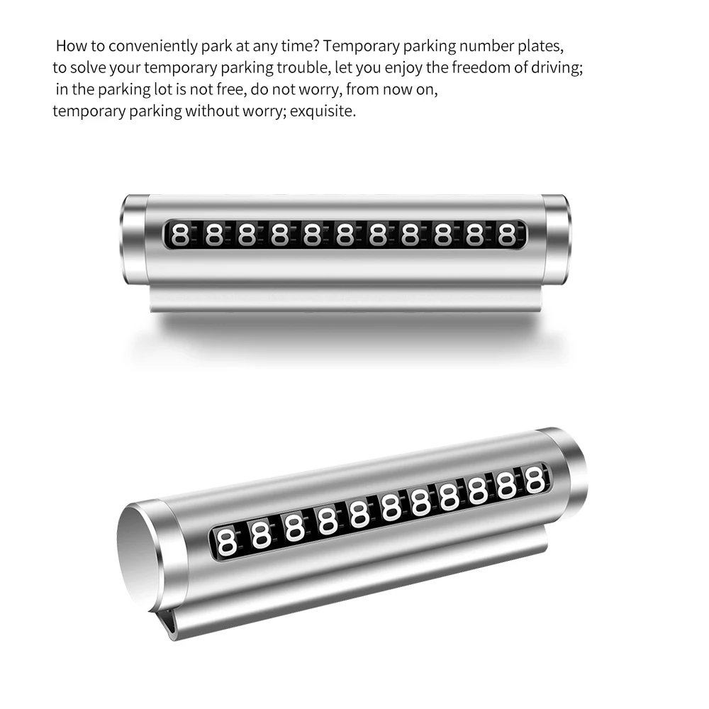 Примечание: Парфюмерный элемент ABS не металлический материал, но это идеальный дизайн, хорошее качество, можно установить парфюм, также могут быть хорошими временными парковочными карточками! 1. Нажмите, чтобы изменить номер: одним нажатием вы можете переключить дисплей и скрыть номер за одну секунду, что может защитить конфиденциальность владельца.