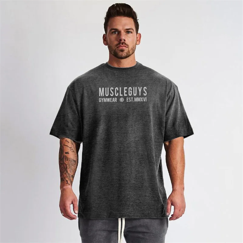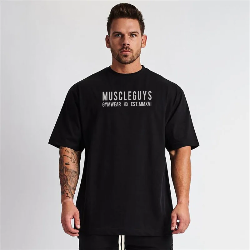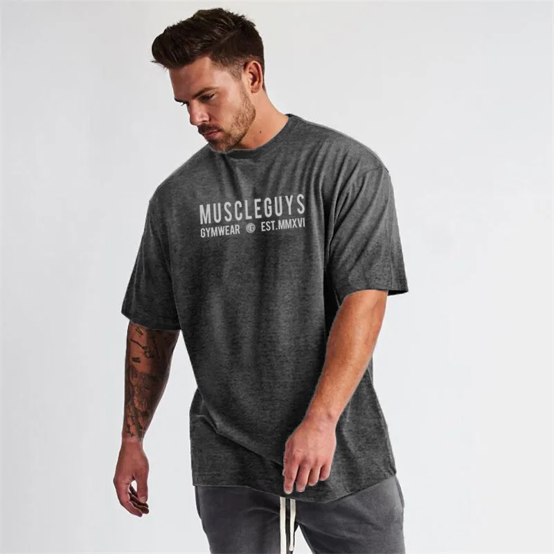 Бренд Muscleguys, негабаритная футболка, Мужская футболка со спущенными плечами, короткий рукав, футболка для фитнеса, летняя свободная одежда для спортзала, топы для бодибилдинга